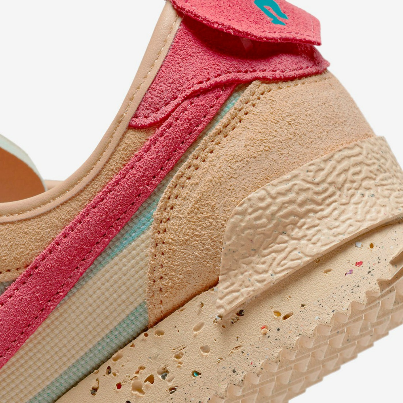 红色 Swoosh 搭配下层米白、灰绿相间的条纹,呈现独特的复古韵味。