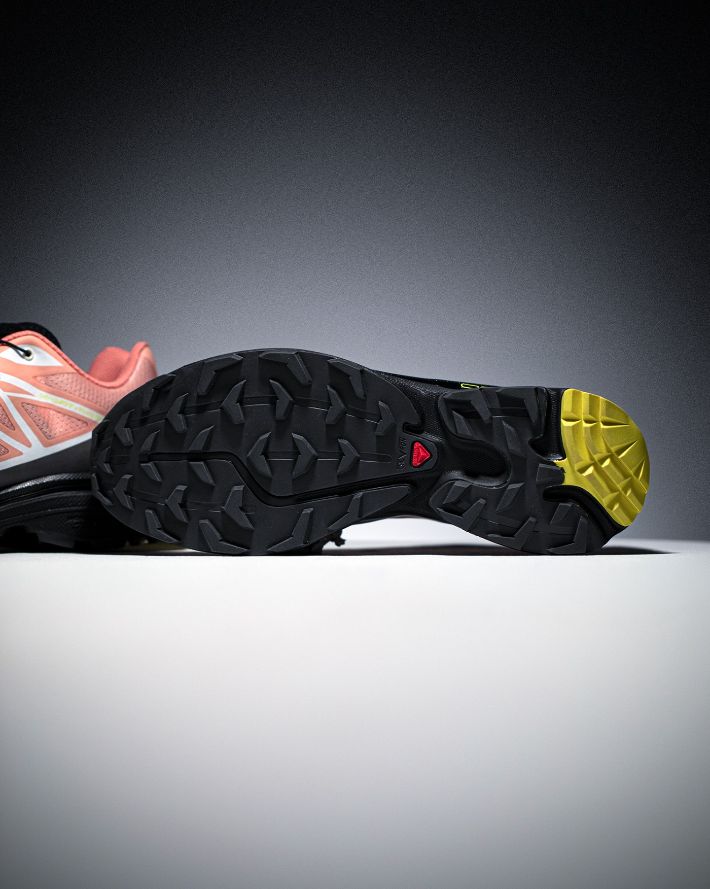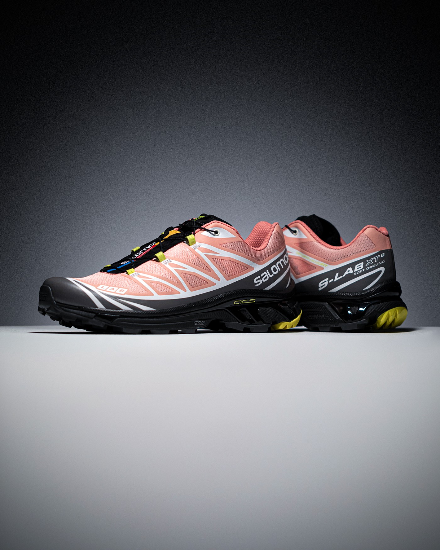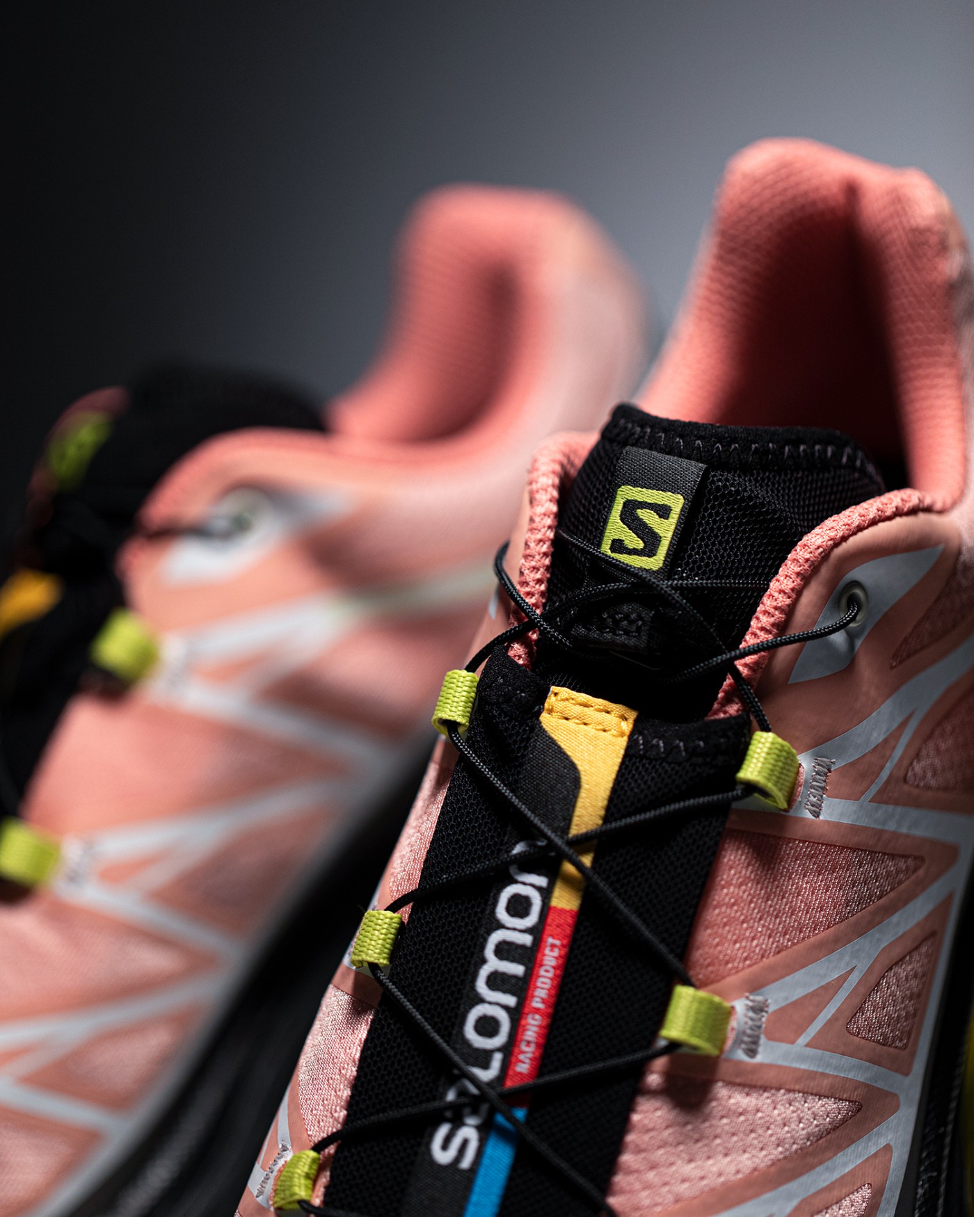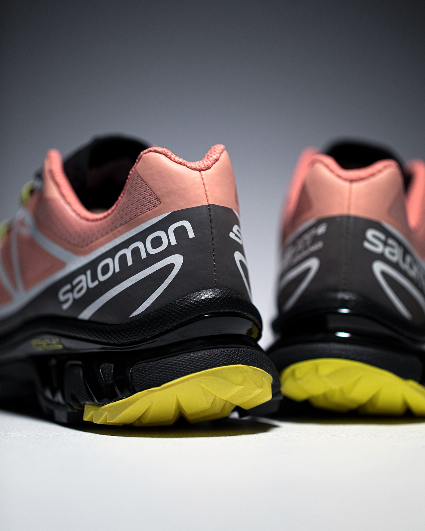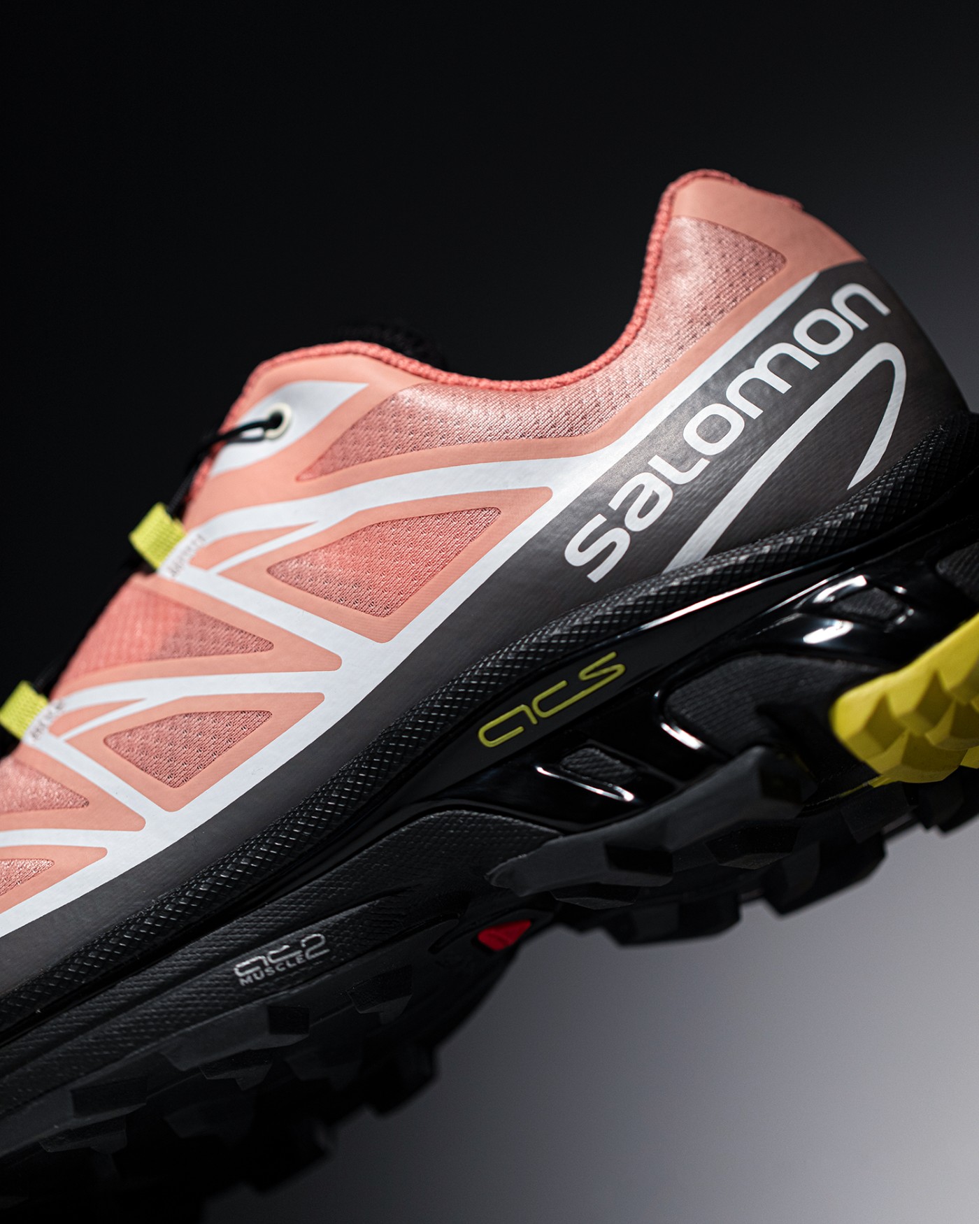除了大面积粉色、黑色以及白色之外,细节处点缀荧光黄色,后跟位置醒目的 Salomon 字样,彰显品牌身份。