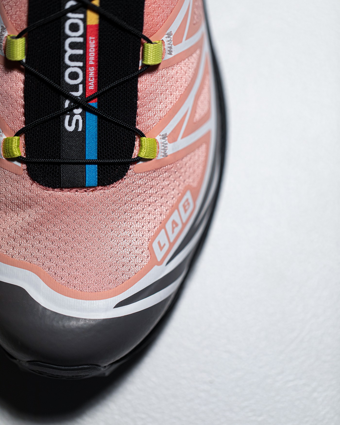 整双鞋承袭 Salomon XT-6 的标志性设计,大面积致密织物材质打造鞋面,鞋头辅以黑色热熔压胶处理。