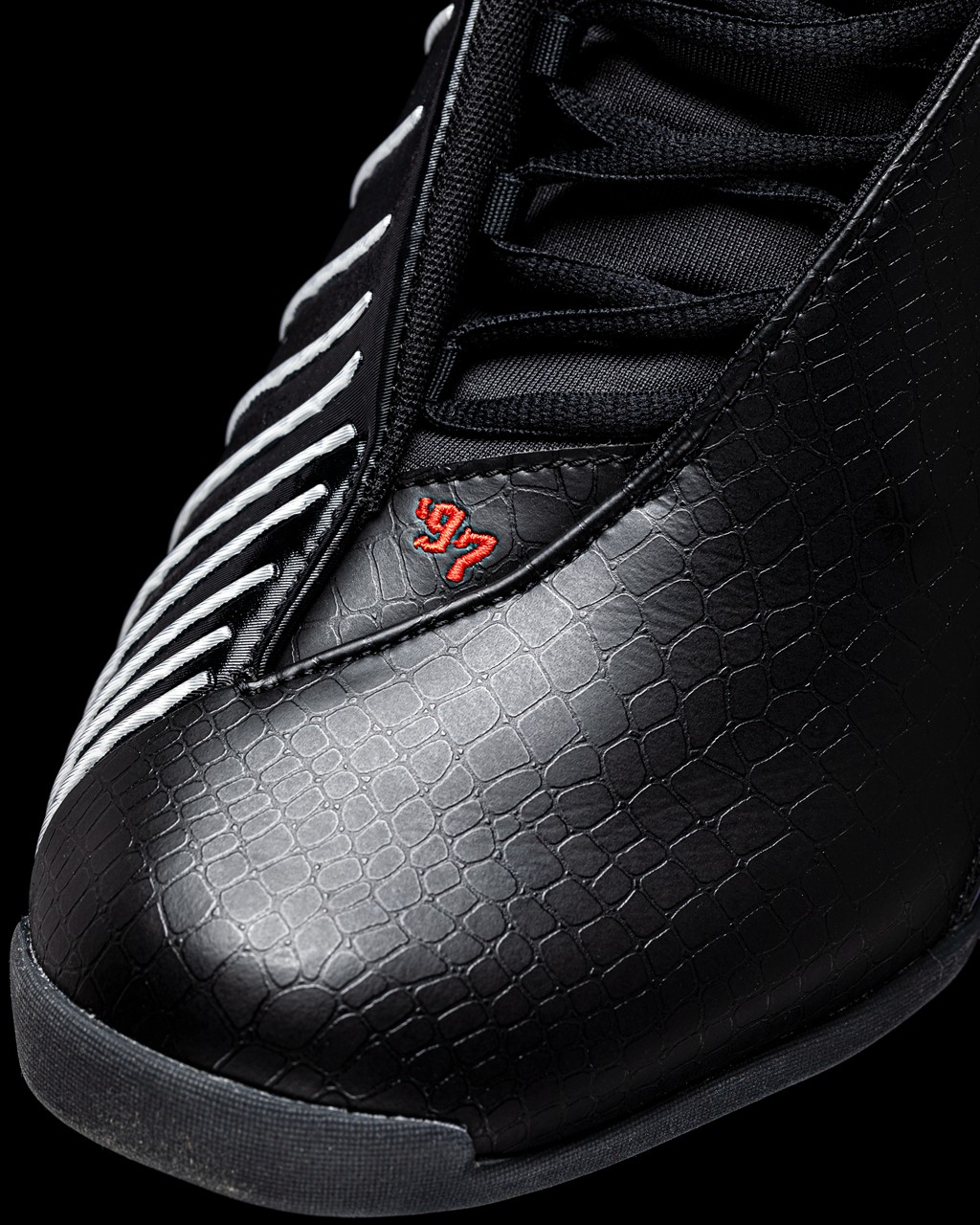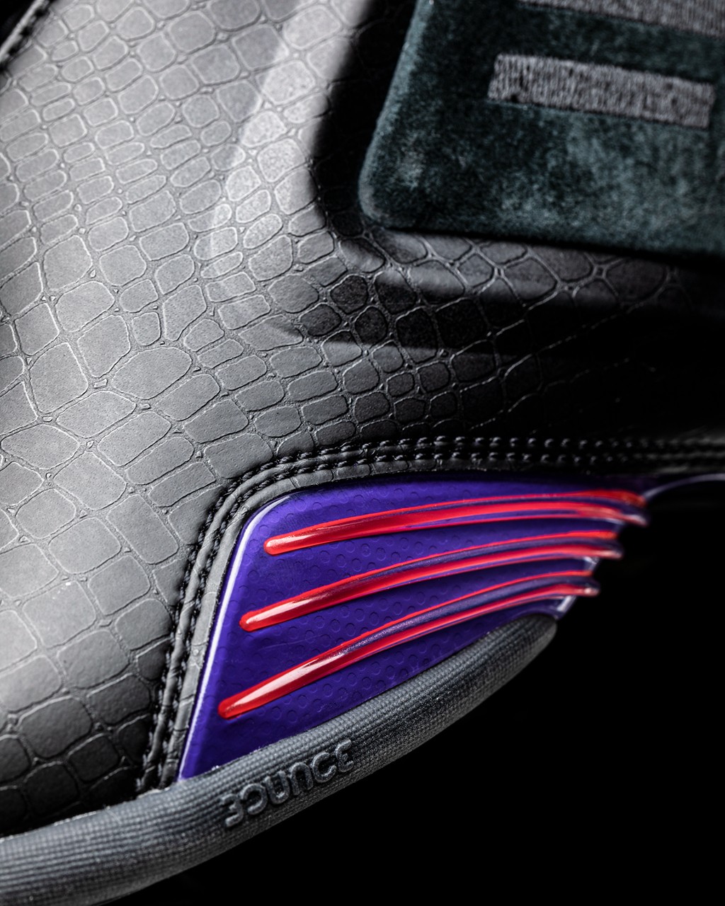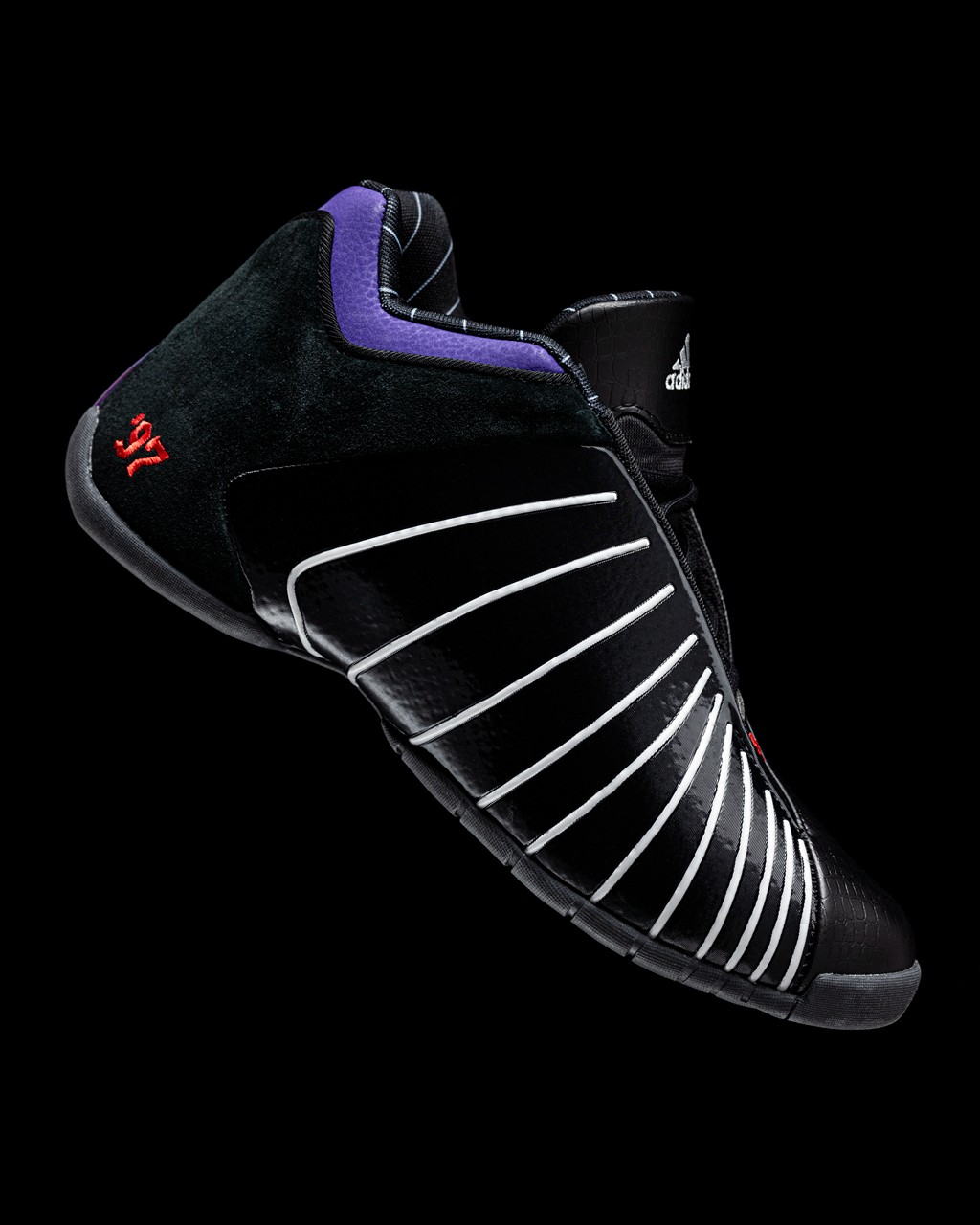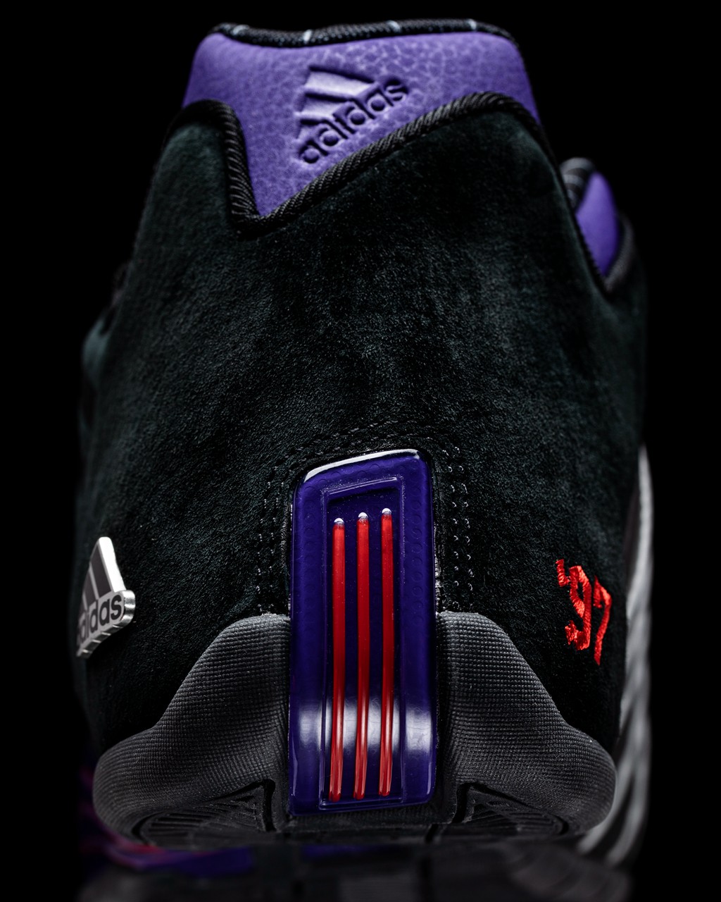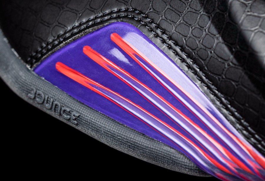细节方面,鞋头和后跟两处 “97” 字样刺绣,配合橘红、紫色的猛龙主题色,致敬 1997 年麦迪入选多伦多猛龙队。