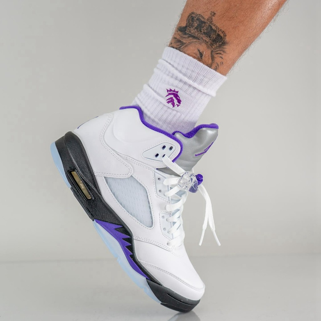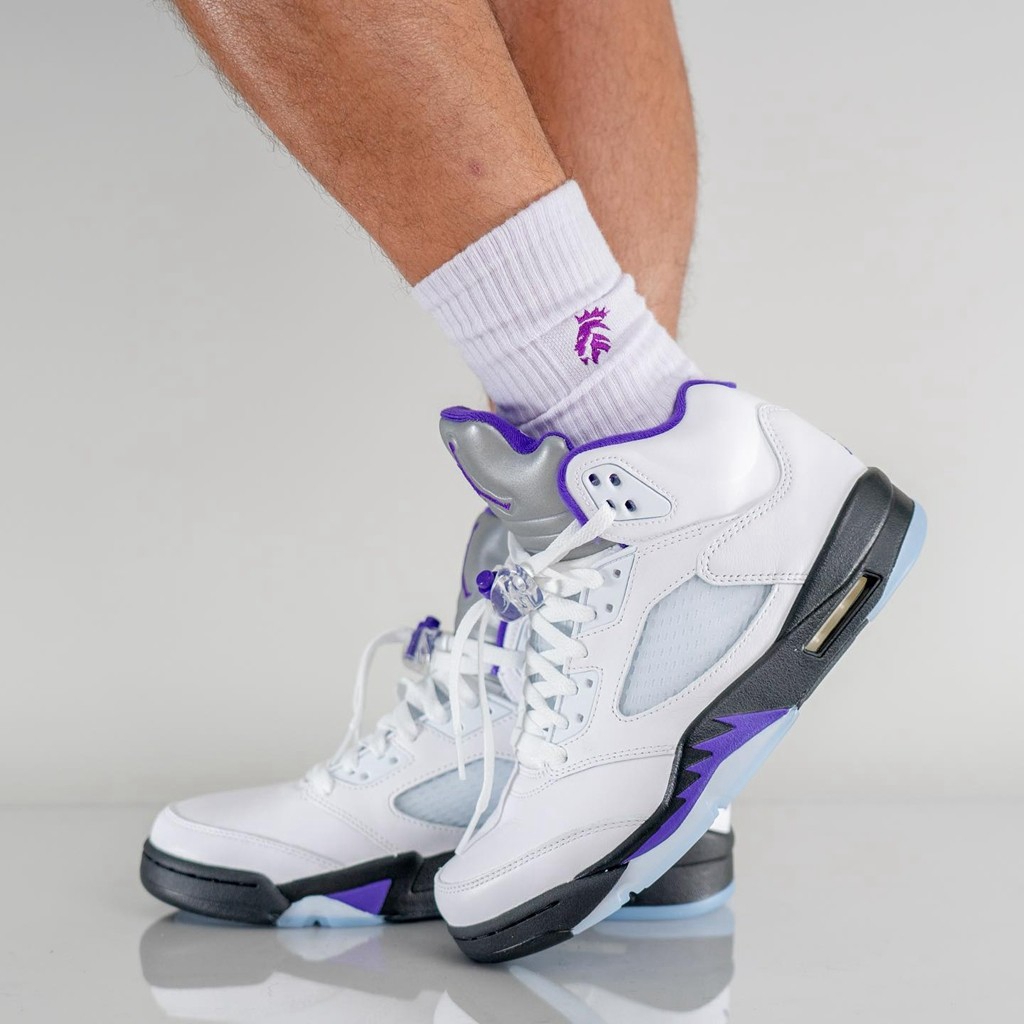 「康扣」Concord 在 Air Jordan 11 的带动下,成功跻身 Air Jordan 系列中最经典的配色之一,如今又呈现在 Air Jordan 5 上,别有一番滋味。