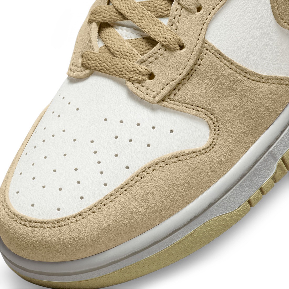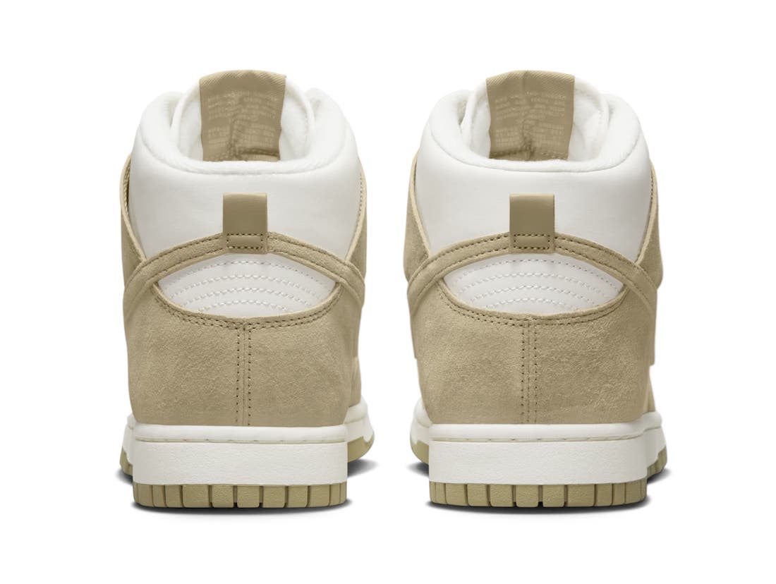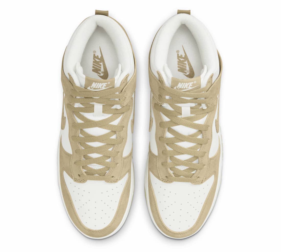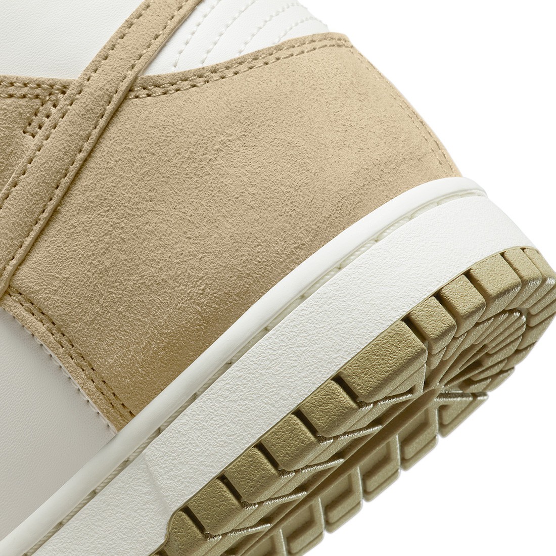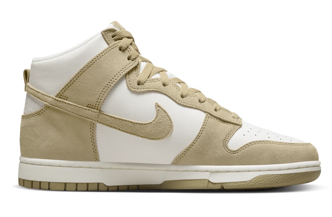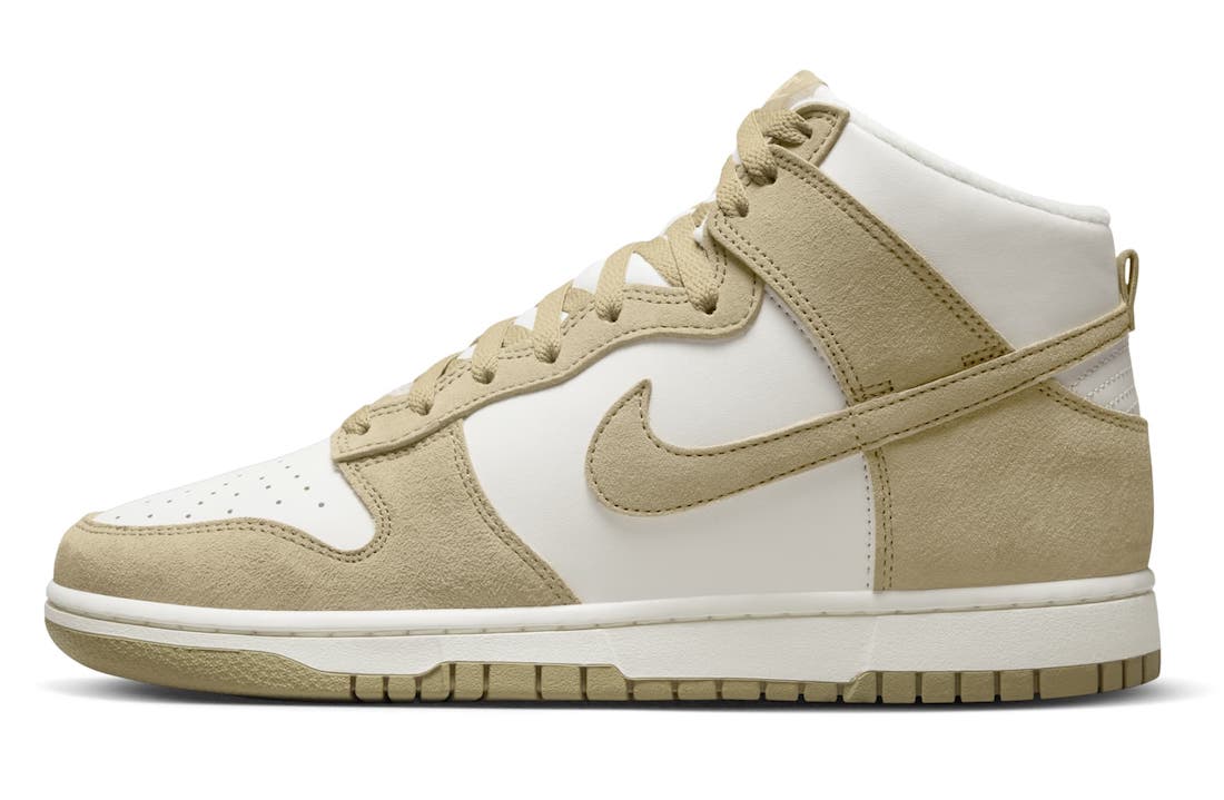 鞋身采用 Dunk High 惯用的白色皮革基底,覆盖沙色麂皮框架,配合高帮的造型,复古气息浓郁。
