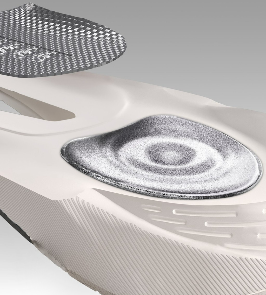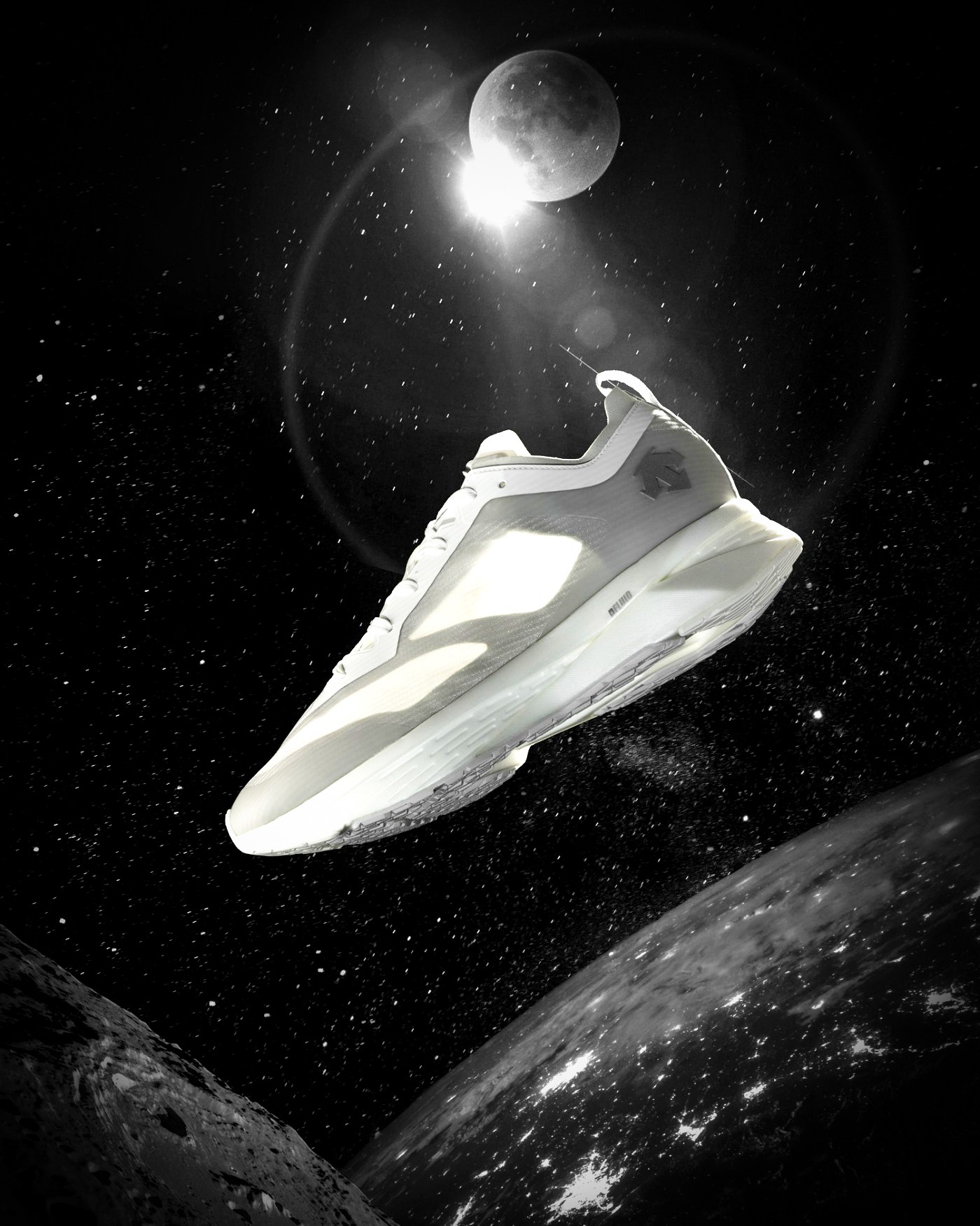 不仅双层超临界发泡中底内嵌碳纤维稳定片,后跟注入迪桑特最新研发的 D-FLUID 应变流科技,更可随运动强度的改变,而自动调整缓震强度。