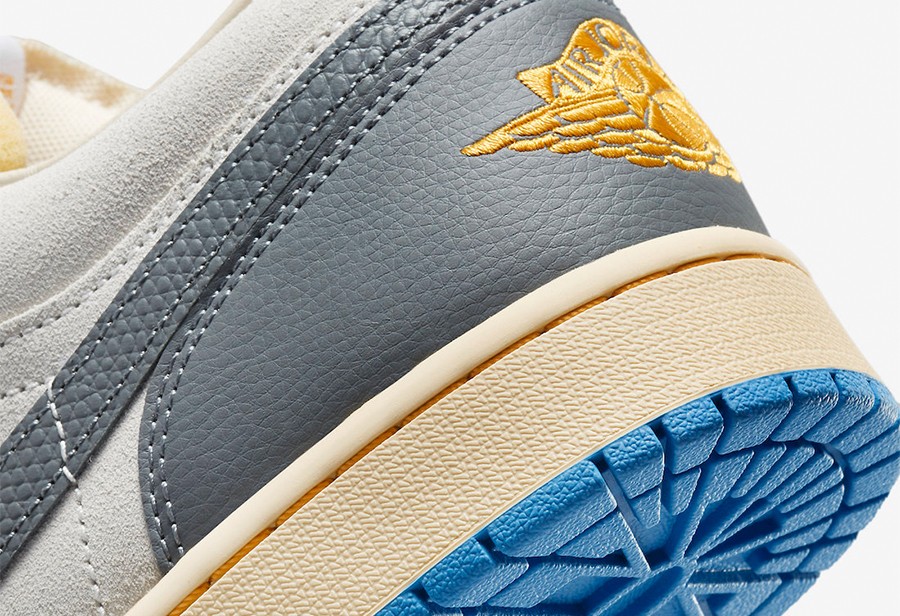 其他细节包括做旧的中底和后跟部的黄色翅膀,细节设计拉满。