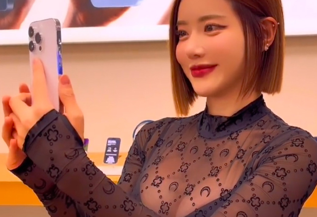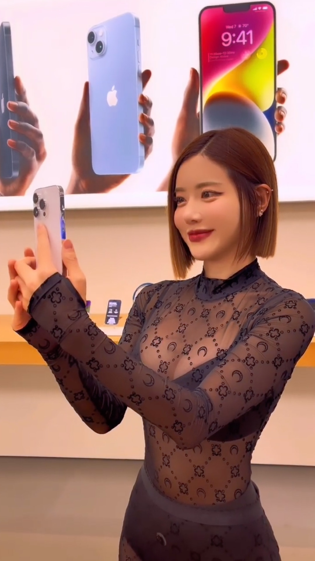 她还以一身透视装现身 Apple 店铺,为我们展示了 iPhone 14 Pro 的开箱。