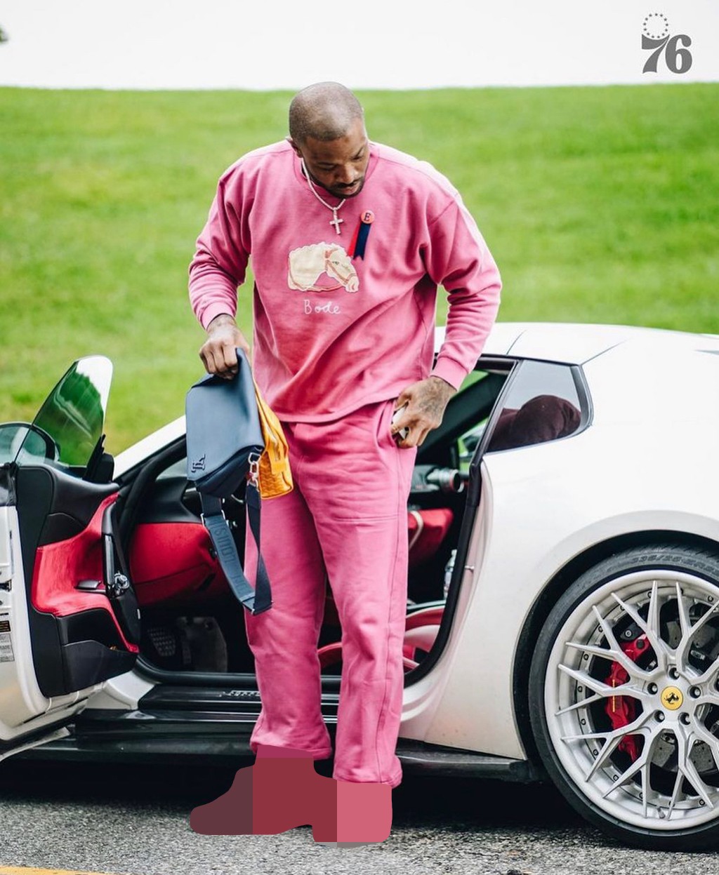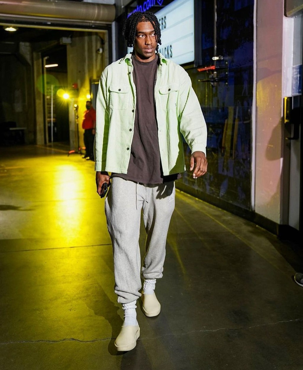 前两天的季前赛前,特伦斯·曼选择了一双 Fear Of God 拖鞋,并且很好地融入了自己的穿搭中。