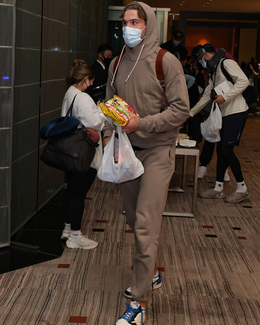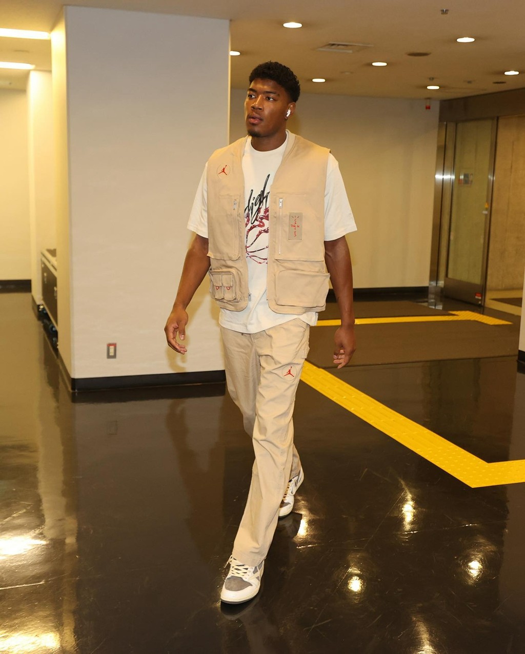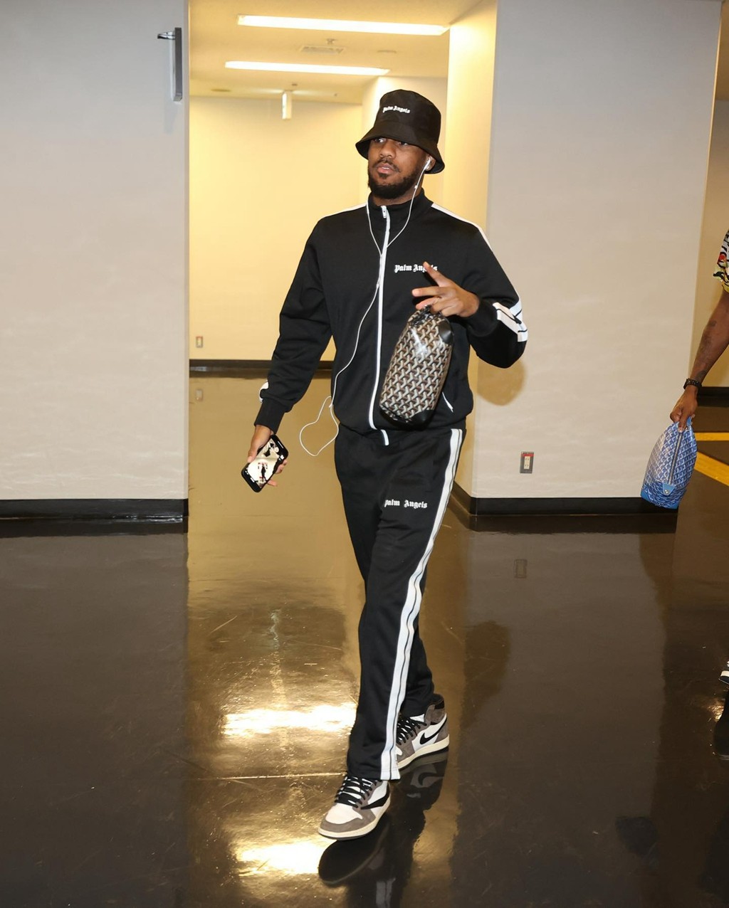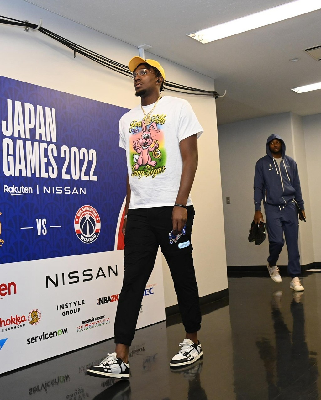 首次回到家乡作战的八村塁,入场前的穿搭完美诠释什么叫一个合格的代言人,从头到脚全部是 Travis Scott 联名产品,尤其是脚上的倒钩 3.0 格外瞩目!