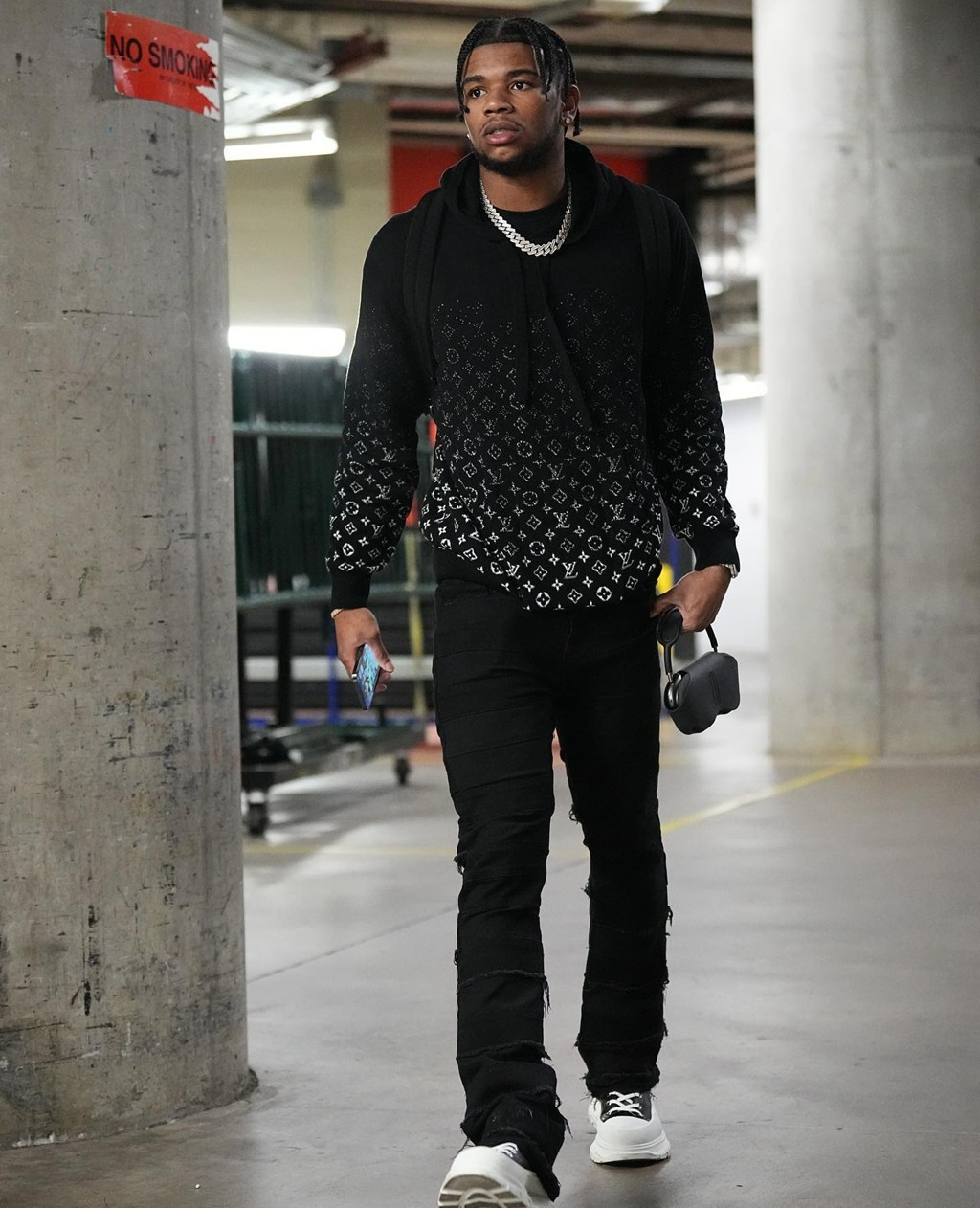 可以看到杰登·哈迪私下衣品还算不错,没有选择大家都在穿的 Nike、Jordan,而是上脚一双 Alexander McQueen 帆布鞋。