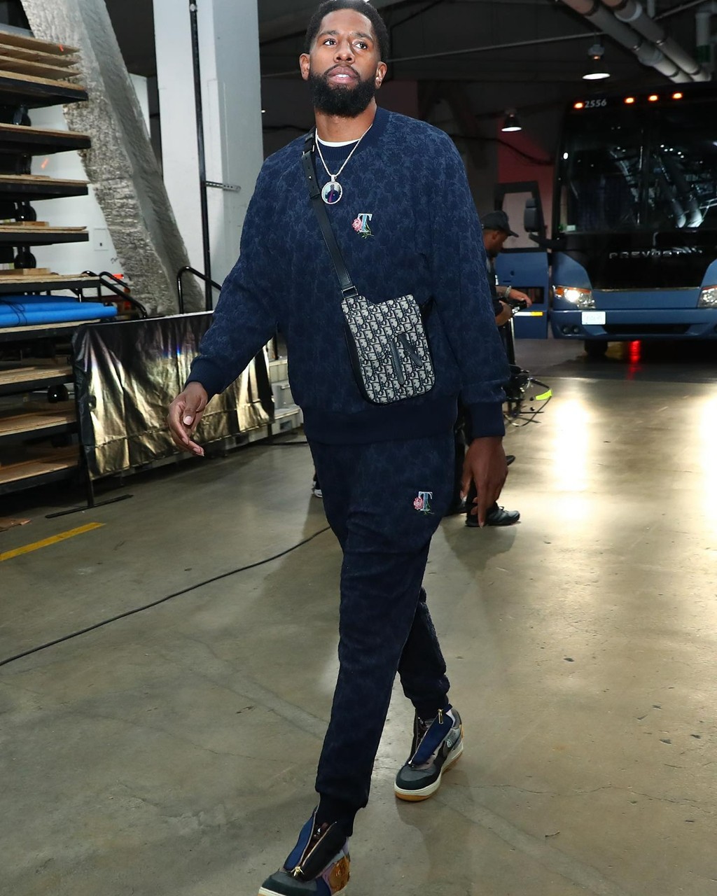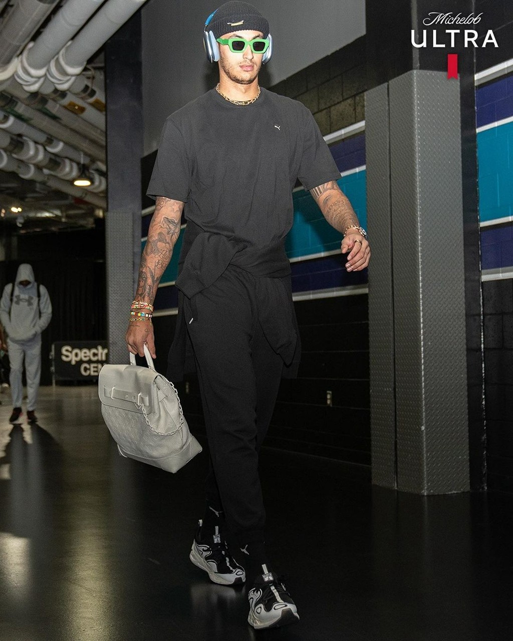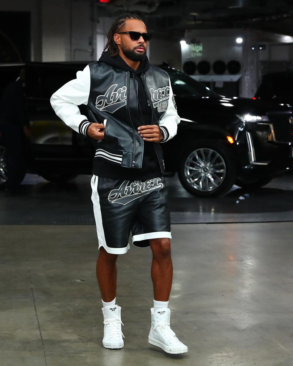 米尔斯从曾经马刺队的 “毛头小子”,已经成了一名老将,球鞋选择也相对来说成熟化一些,比如这双 PRADA 高帮板鞋,随鞋还附赠小包,但米尔斯应该是把它拆掉了。