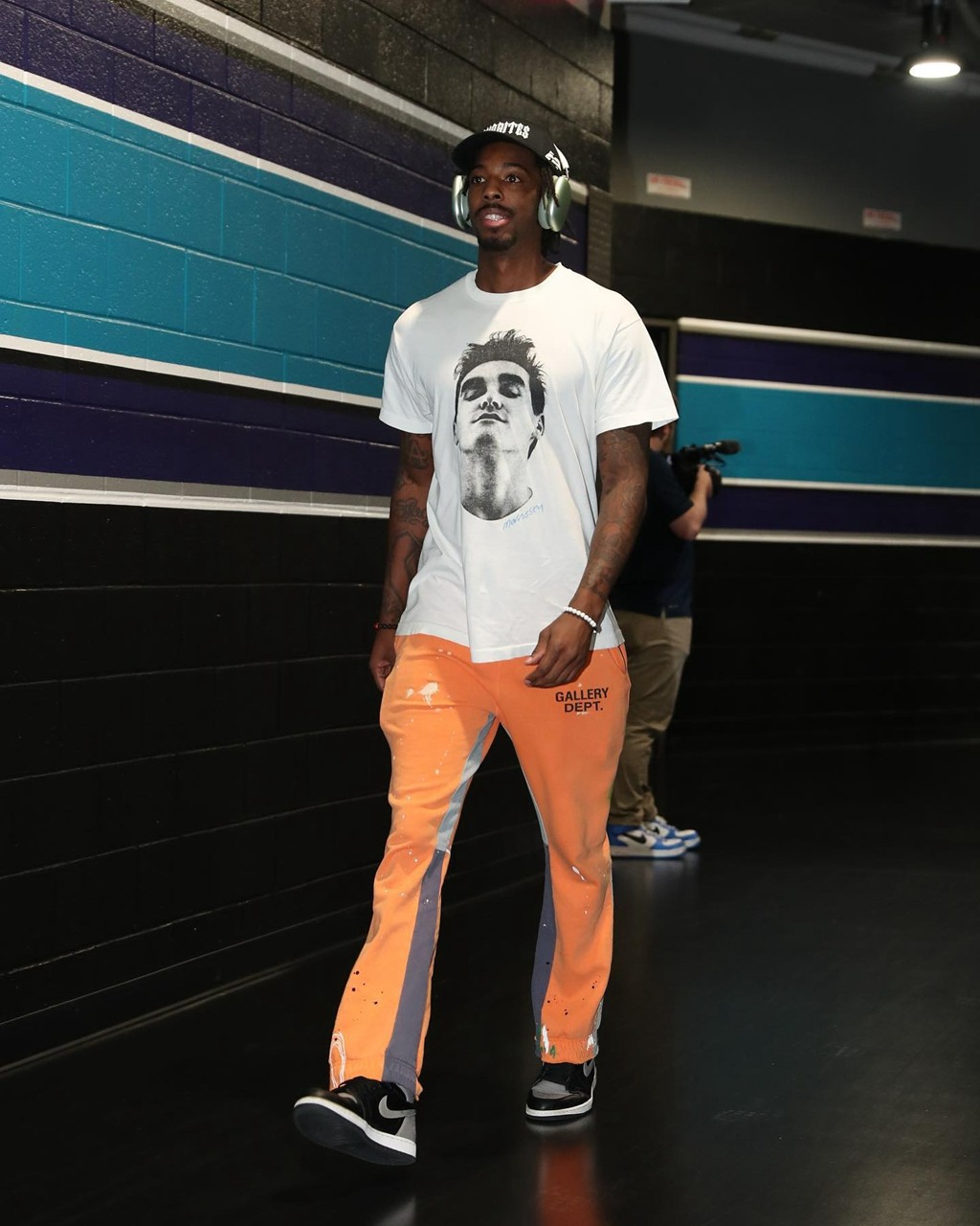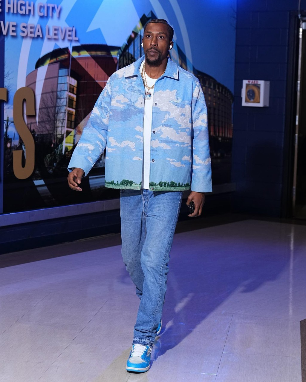 刚刚加盟掘金的「前湖人冠军射手」波普,在季前赛前上脚一双经典的 OFF-WHITE x Air Jordan 1 “UNC”。