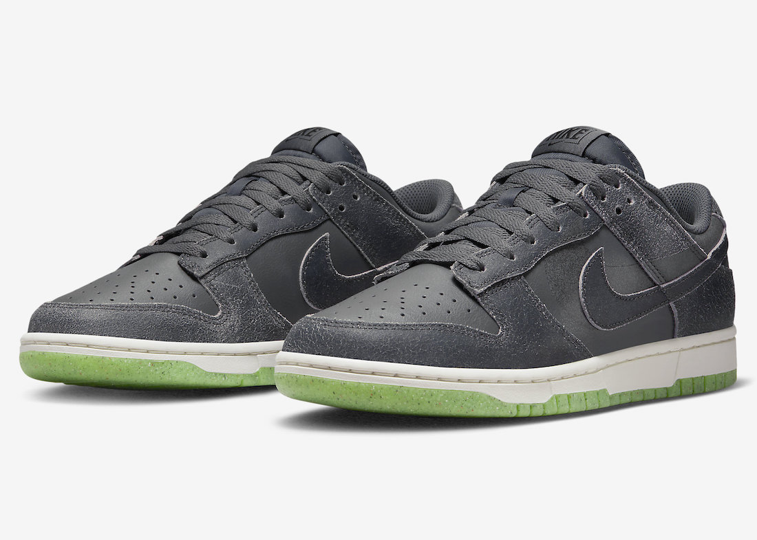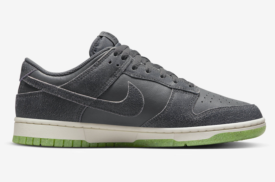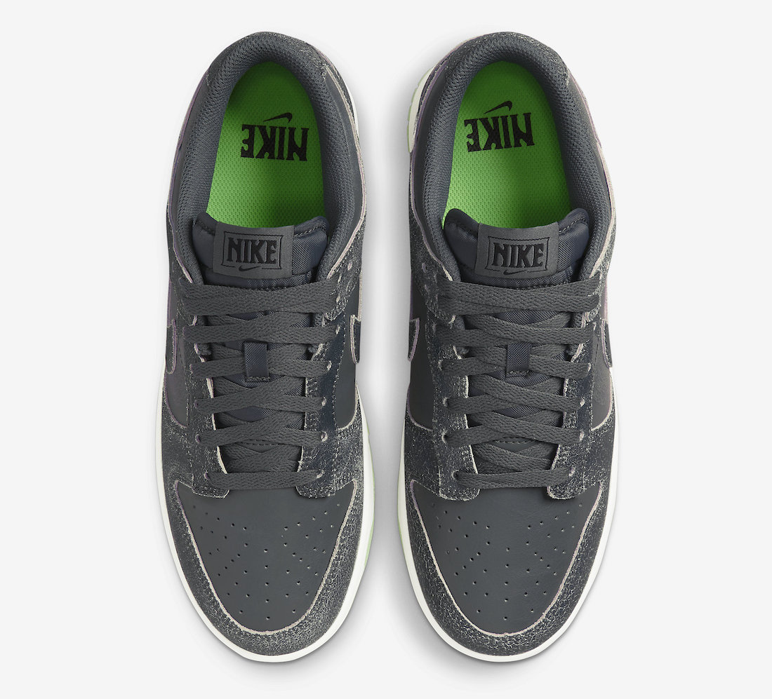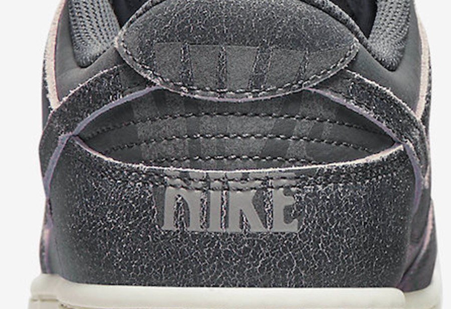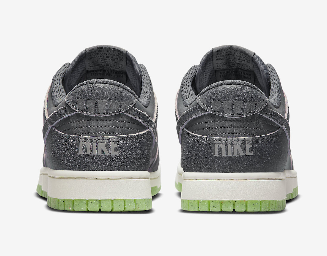 首先是每年都会有的万圣节 Dunk Low。今年这款采用了深灰色为主体,鞋面采用龟裂材质和传统皮革拼接打造,呈现出与众不同的质感。