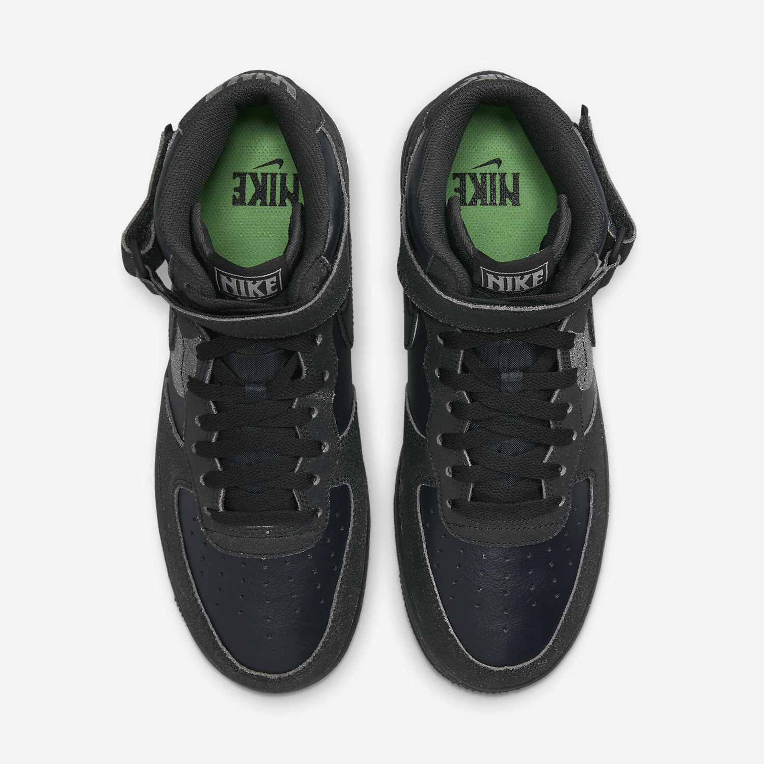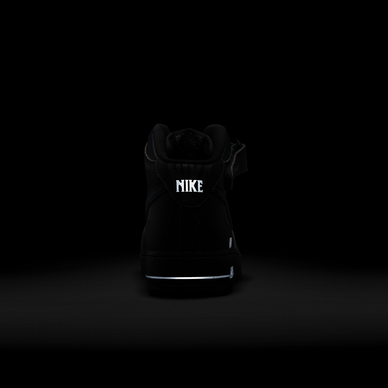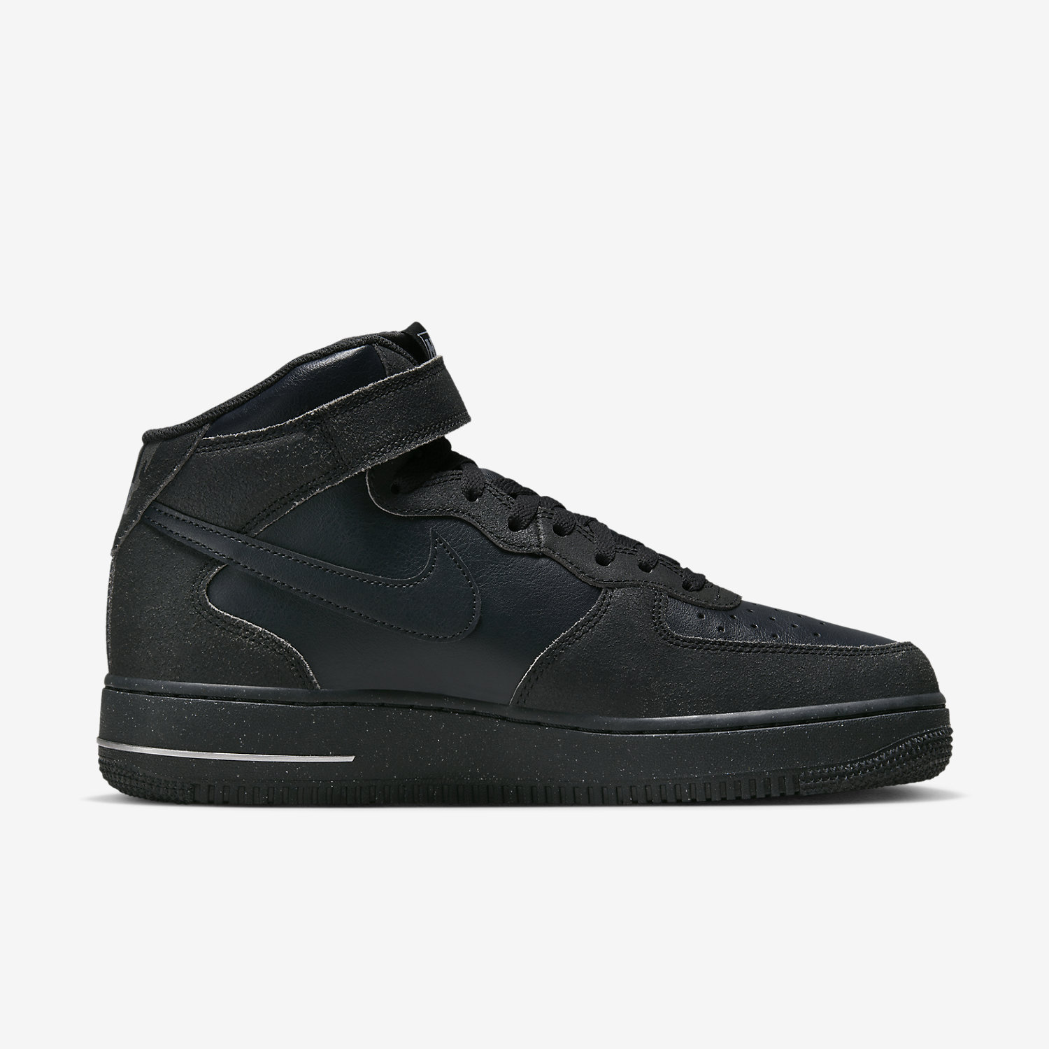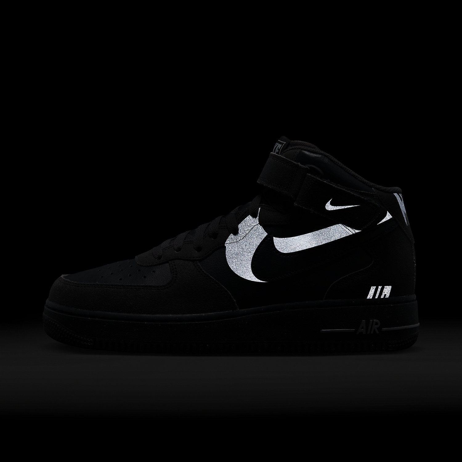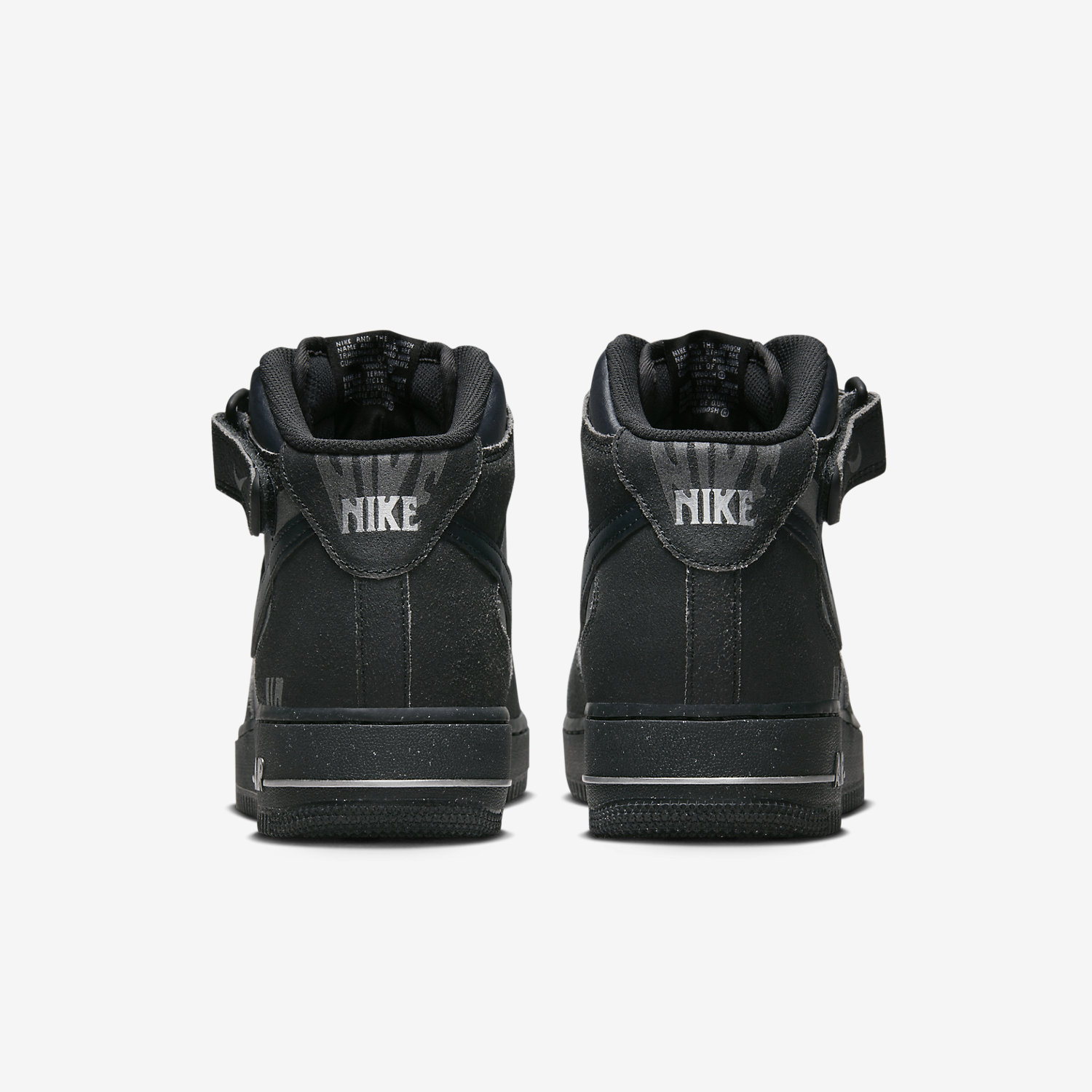 Air Force 1 Mid 采用纯黑色调,鞋身的大 Swoosh 暗纹、后跟 Nike 字样及后跟外侧 Air 字样均有反光效果。