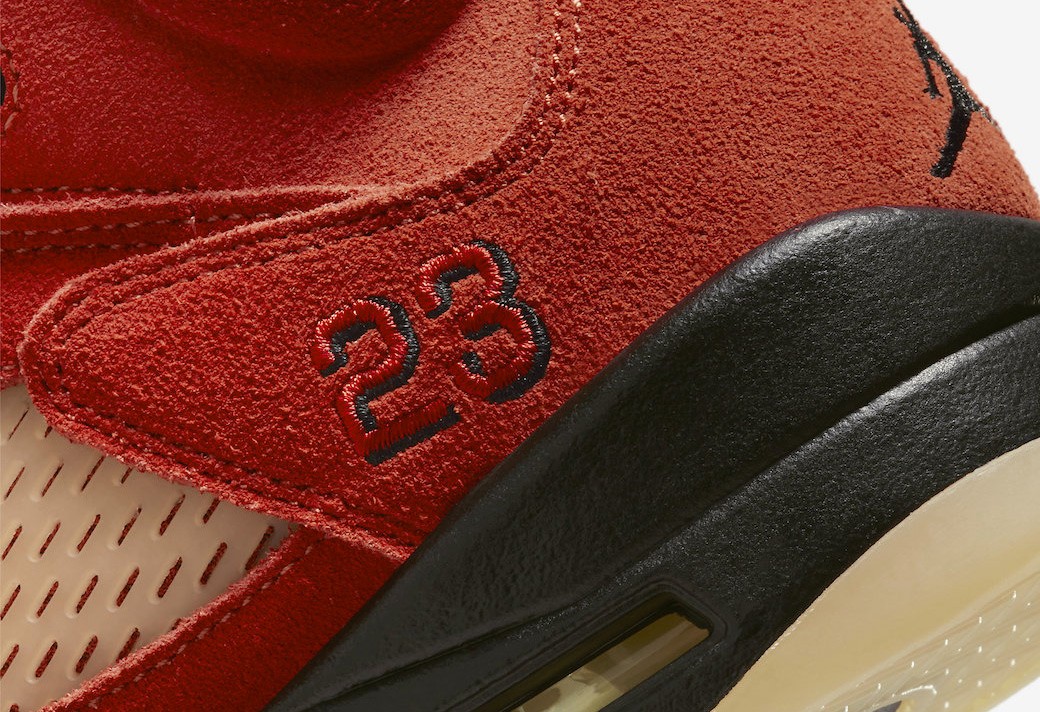 鞋帮「23」刺绣、银灰 3M 鞋舌、后跟飞人刺绣,这些经典的 Air Jordan 5 元素应有尽有。