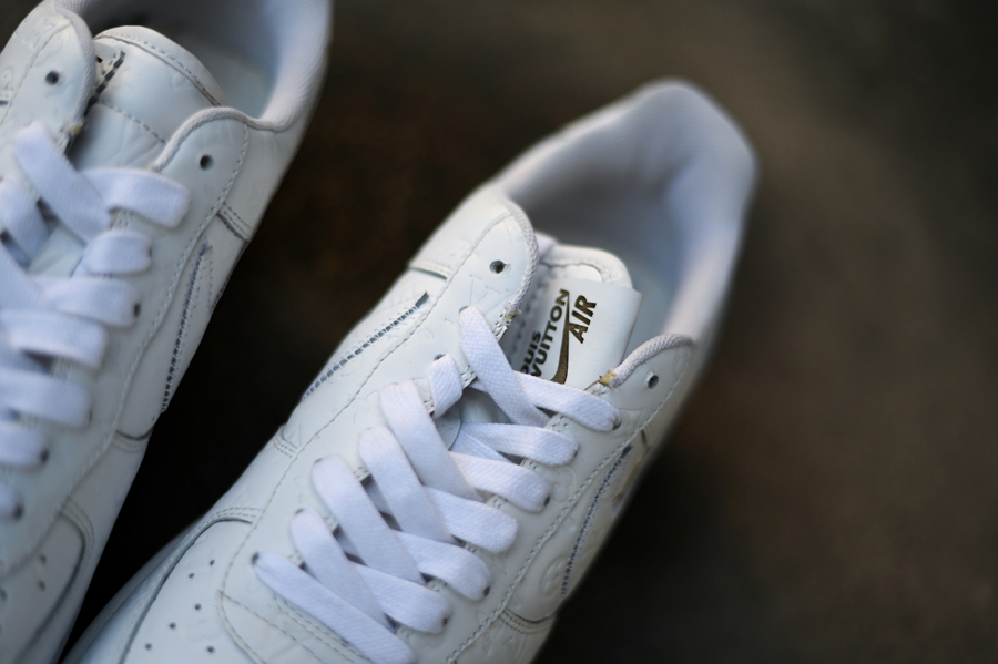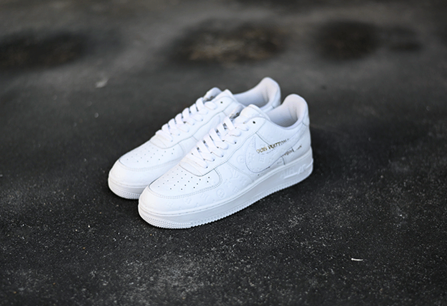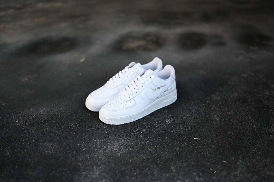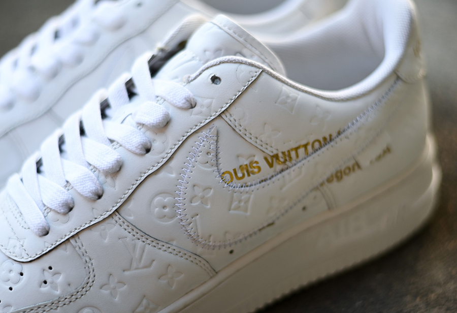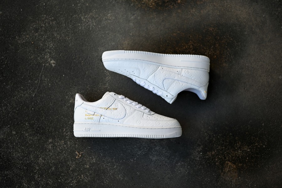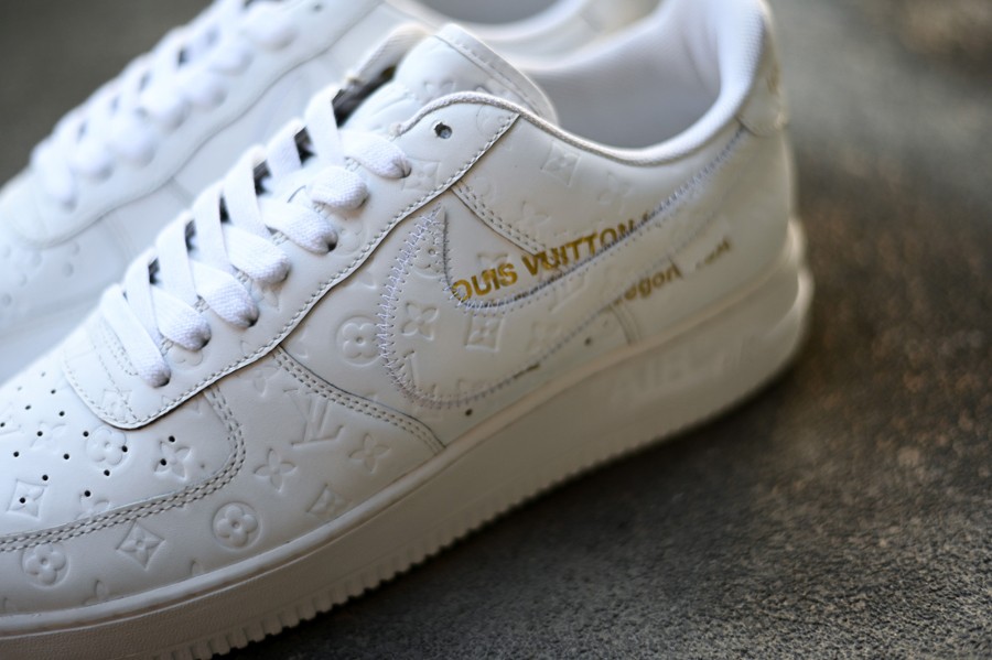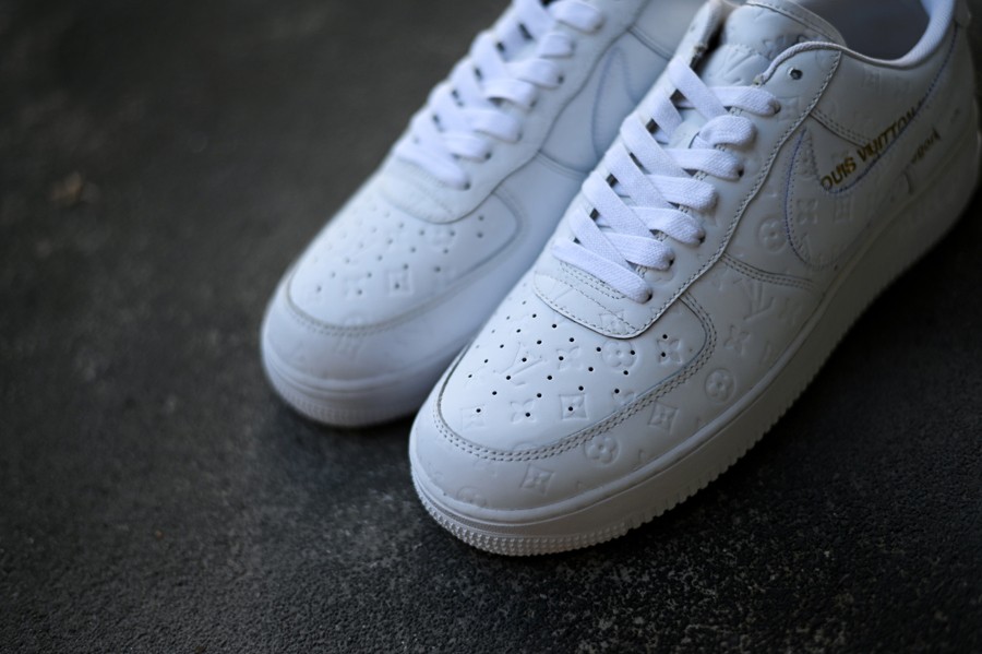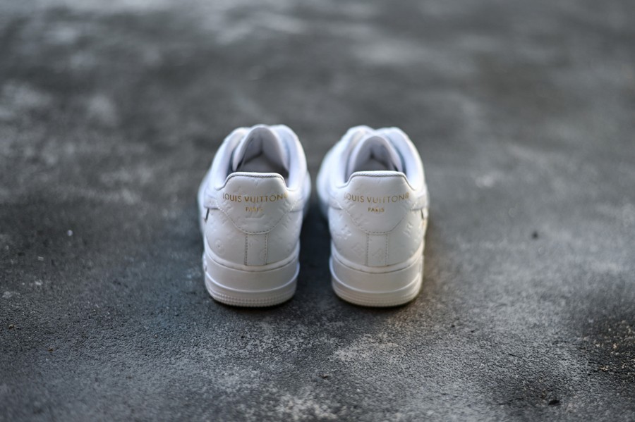 Louis Vuitton Air Force 1 采用了纯白色为主调,鞋身的皮革上带有满印的 LV Logo 将特殊身份展露无遗,同时侧身还带有金色的热压字样,与天价的 Louis Vuitton x OFF-WHITE x Air Force 1 几乎一模一样。