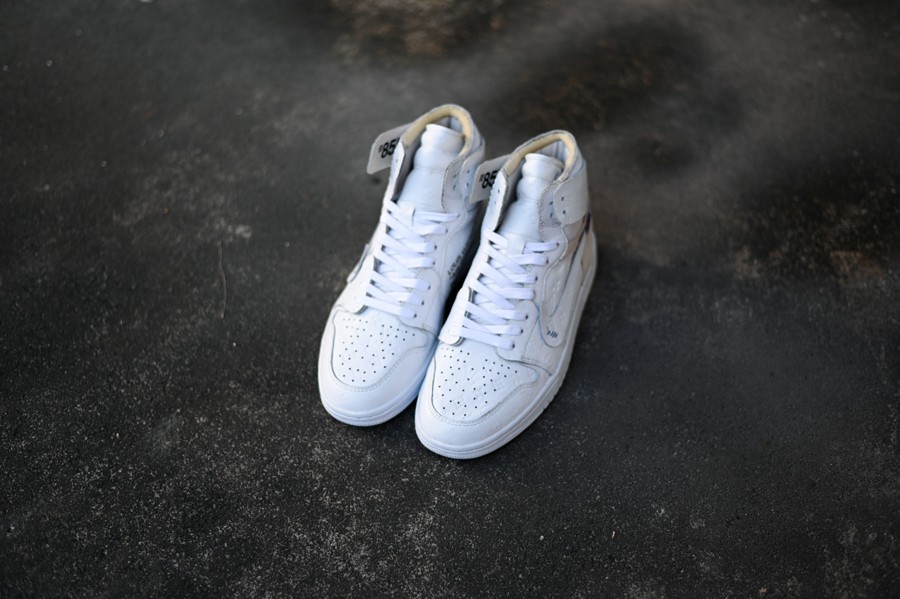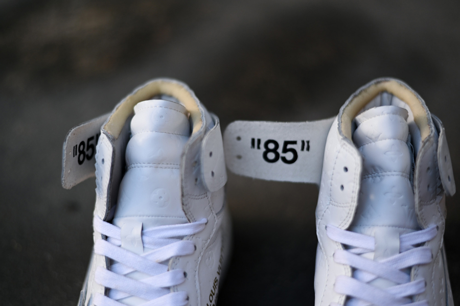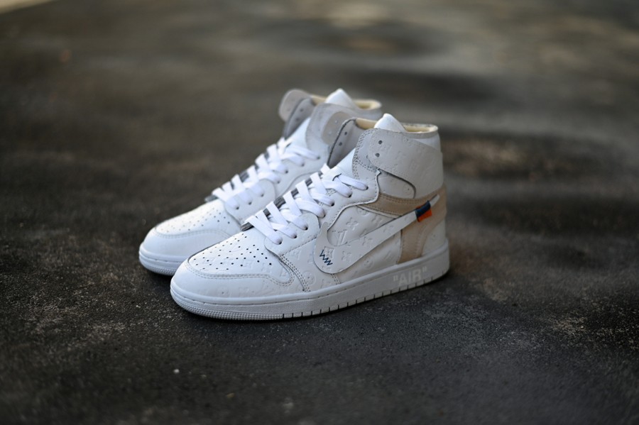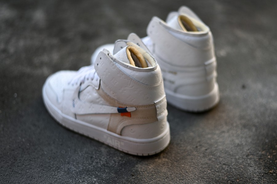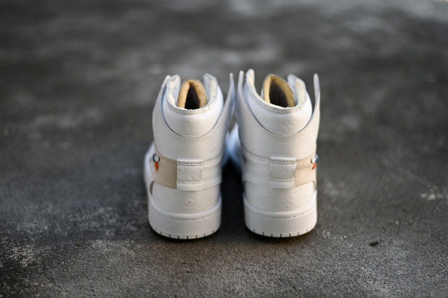 另一双 Louis Vuitton Air Jordan 1 同样选择了白色为主调,鞋身的解构设计也将原本 OFF-WHITE 联名的设计展示了出来。
