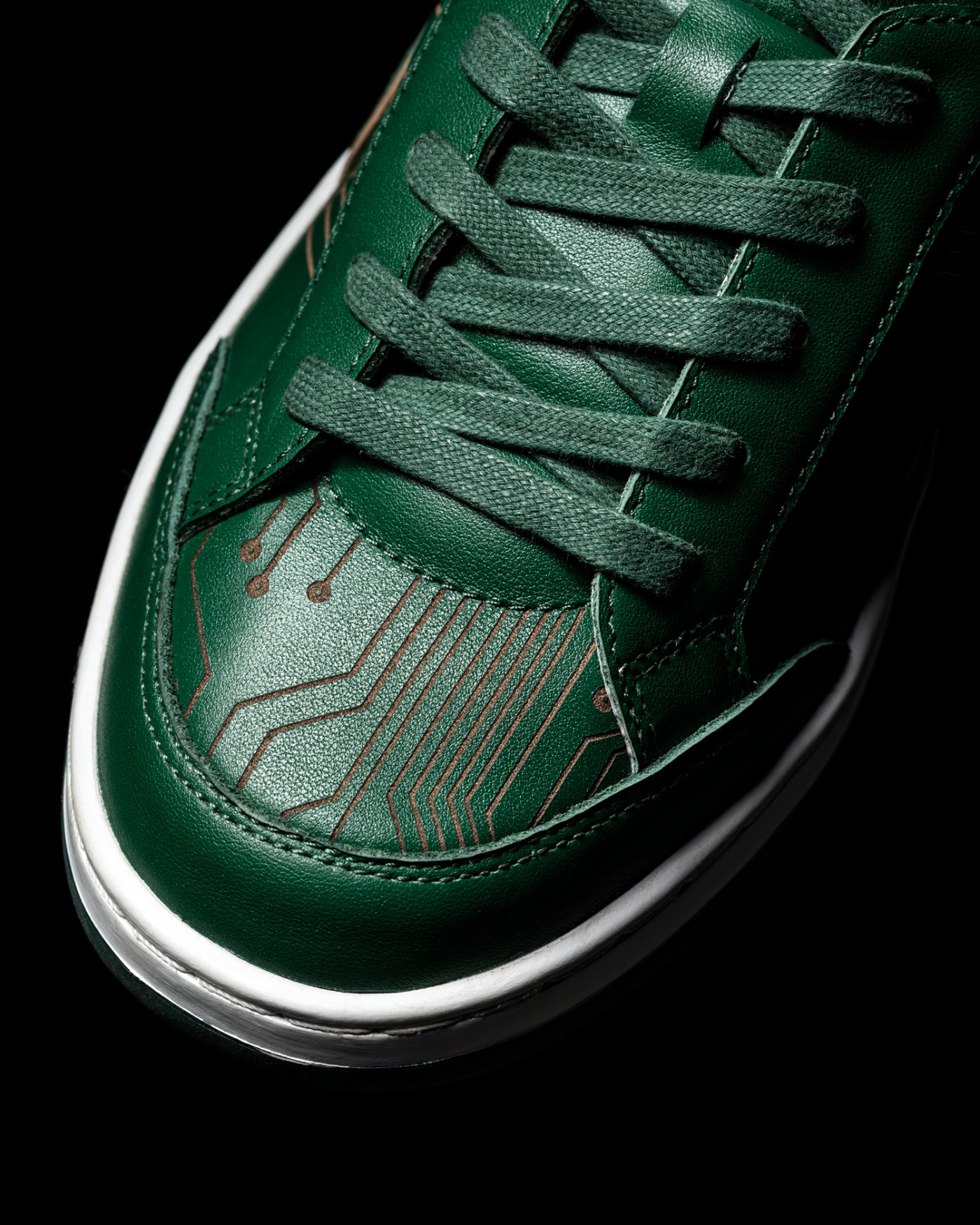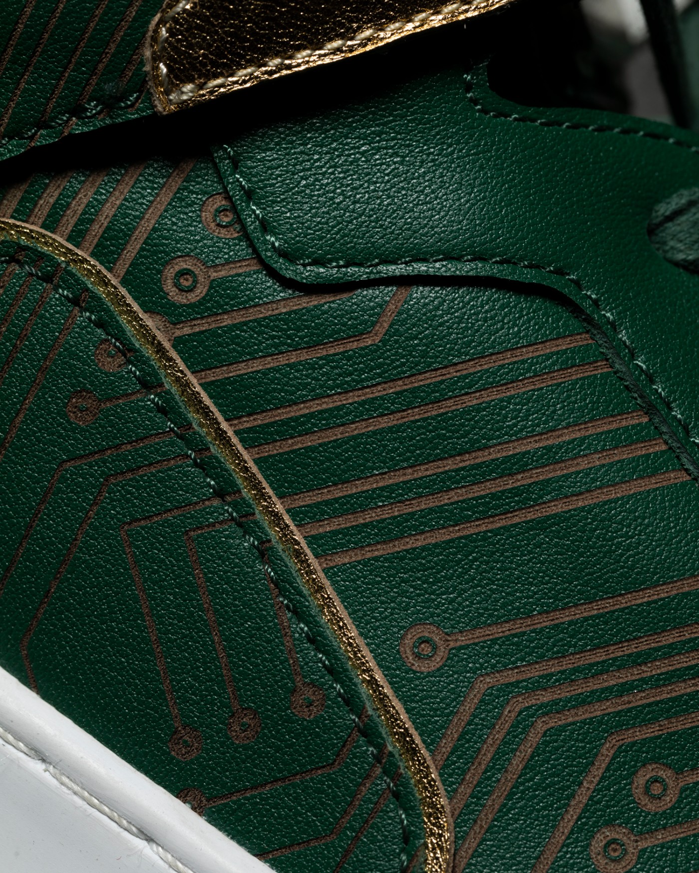 鞋头、侧身分别点缀了镭射电路板纹路,将配色灵感展示了出来。