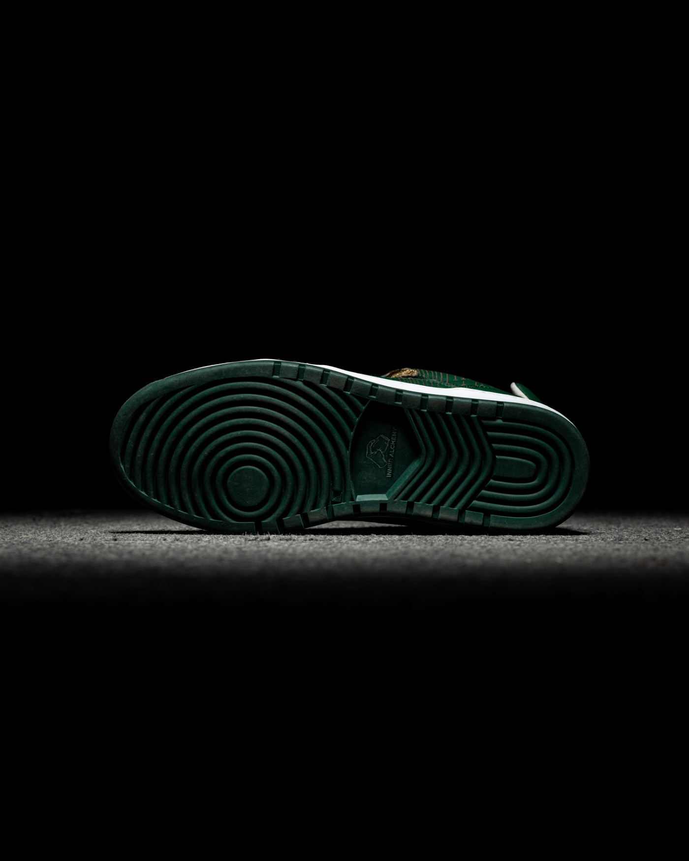 最后以白色中底搭配上与鞋身同色的绿色外底收尾,中间部分还加入了 Inner Alchemy Logo,完善整体造型设计的同时,还彰显出了品牌身份。