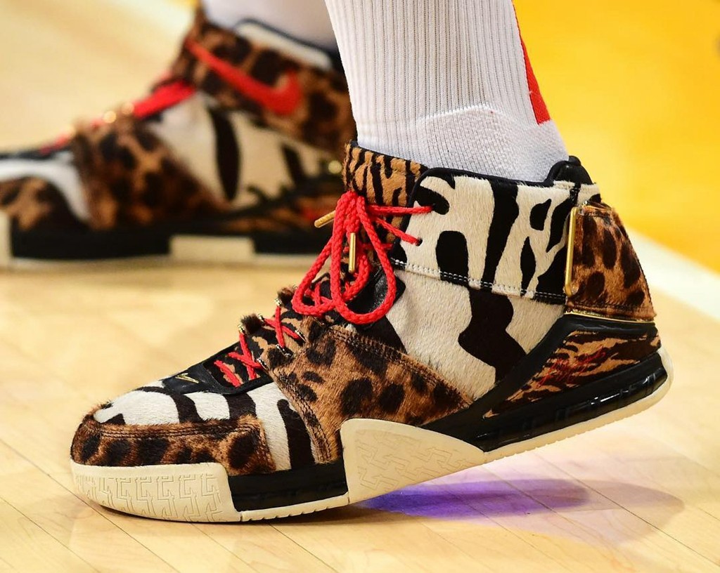 和上一双一样,这双 Nike LeBron 2 “兽纹” 也是专为詹姆斯打造的 F&F 亲友限定,当年詹姆斯亲晒这双骚气无比的配色,给不少玩家留下深刻印象。