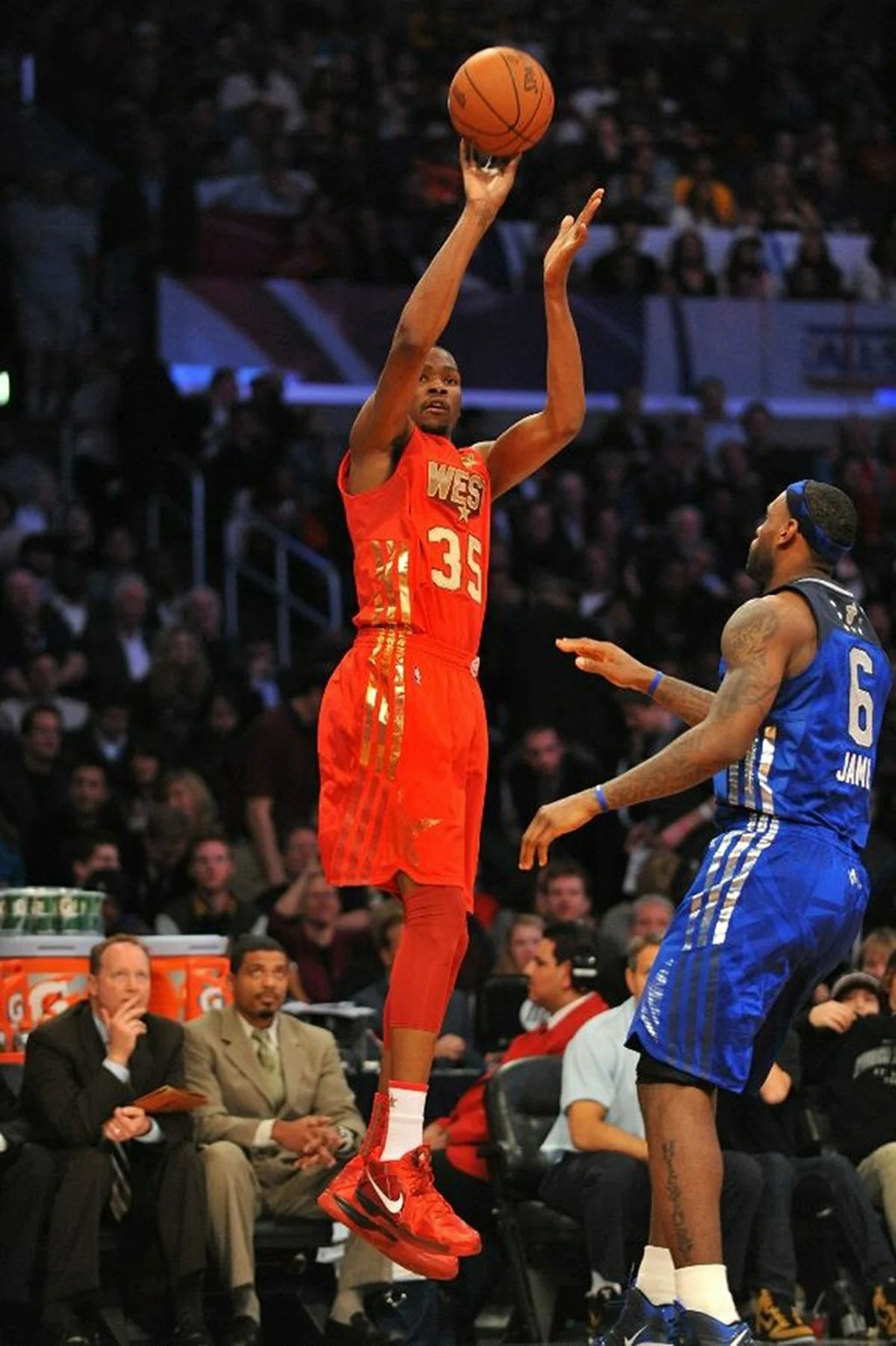 今年首先登场的就是 Nike KD3 “全明星”,覆盖鞋身的珠光红让人过目难忘,当年 KD 穿着这双鞋对位詹姆斯的景象还历历在目。