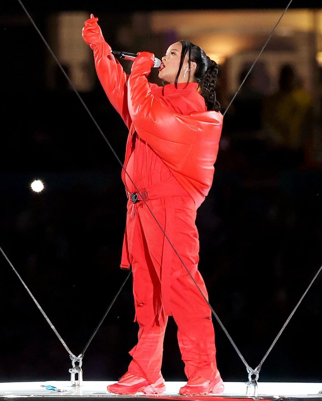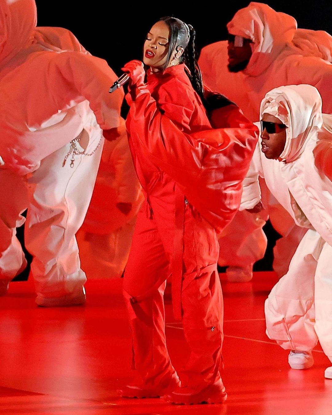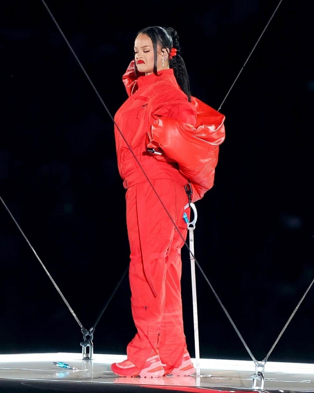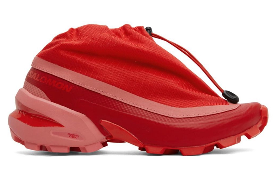 蕾哈娜一袭红衣,上脚的是 Salomon 与 Maison Margiela 的支线 MM6 Maison Margiela 的联名鞋。