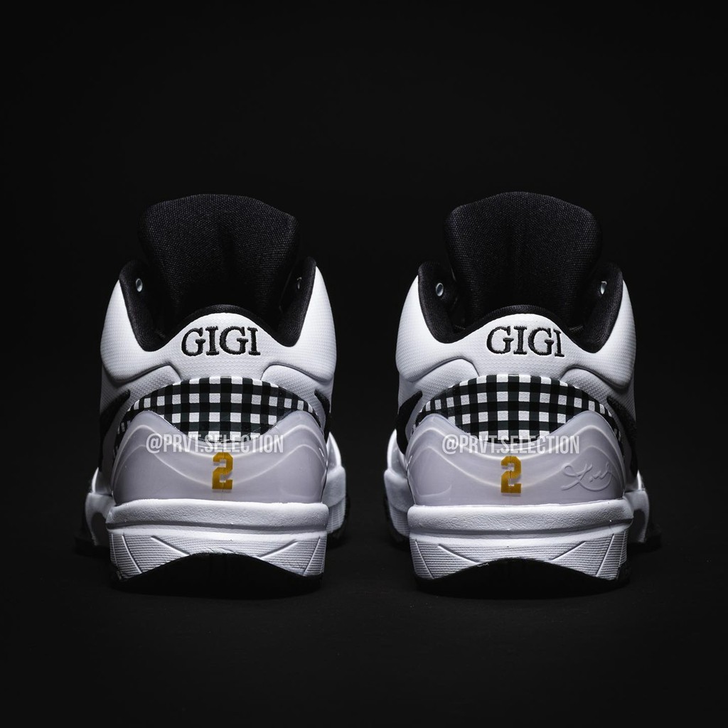 最大亮点当属后跟部分,金色的 GIGI、2 等字样代表科比女儿,下方则是科比签名,以此缅怀这对父女。