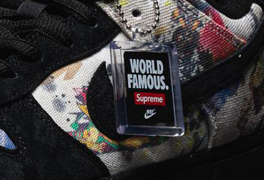 金色鞋标雕刻着 Supreme Logo、鞋带头印有 World Famous 字样,鞋垫也是采用了 Supreme 标志性的大红色,彰显鲜明的联名身份。