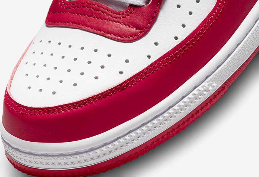 白色中底搭配红色外底收尾,完善整双鞋设计。