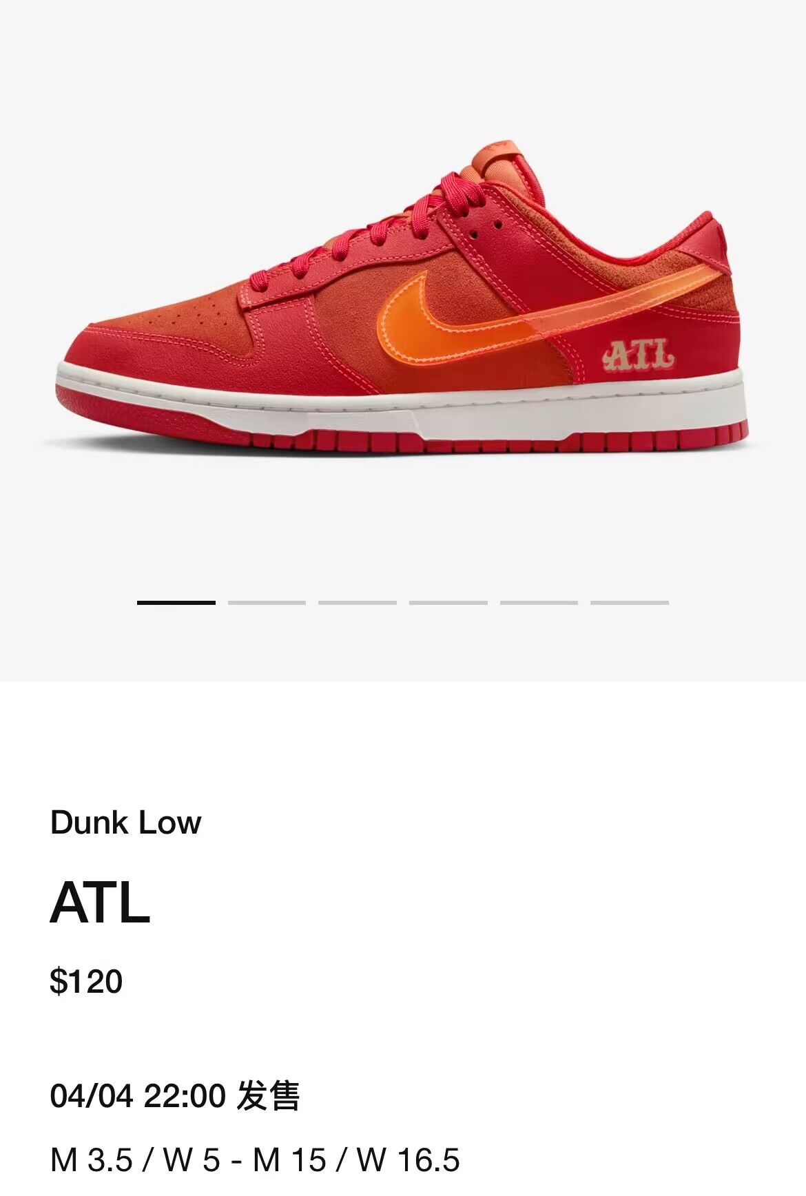 目前,全新 Nike Dunk Low “ATL” 现已上架美区 SNKRS APP,将于 4 月 4 日发售。