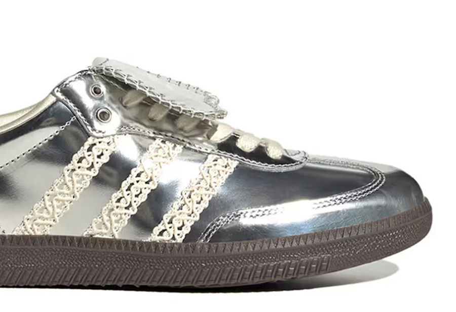 第一双采用经典 SAMBA 鞋型为蓝本,全皮革制成,覆盖着反光的银灰色饰面。