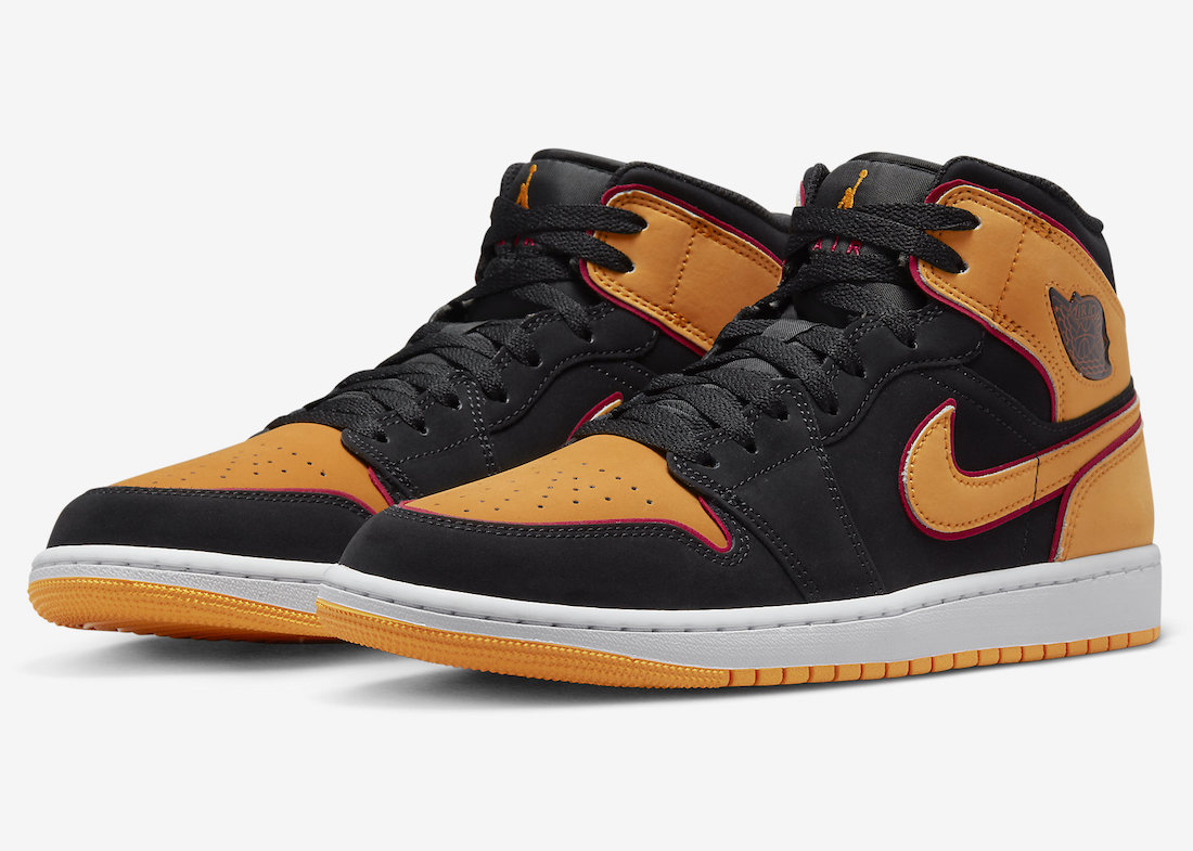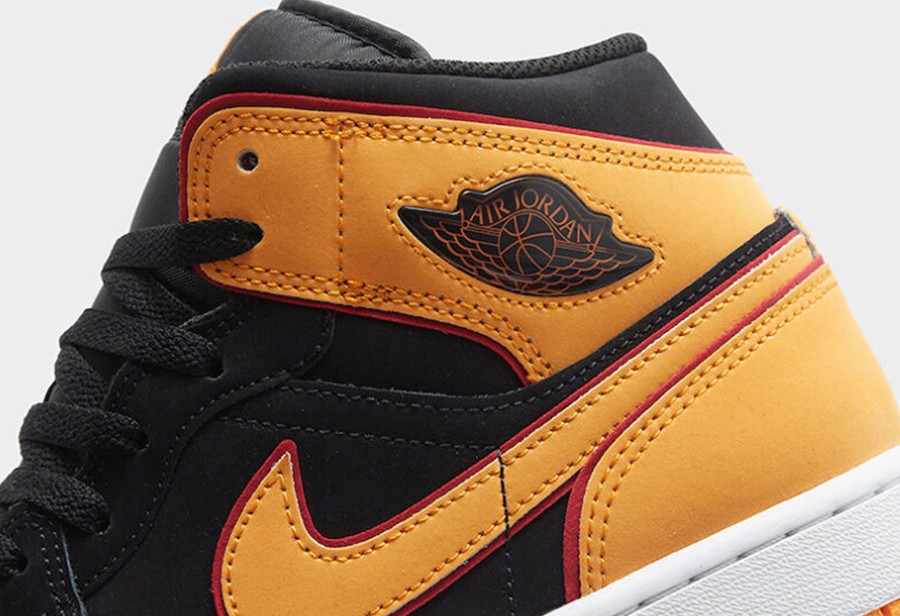此次采用了 Air Jordan 1 的中帮鞋型作为蓝本,配色使用亮眼的黑、白、橙搭配,经典的「扣碎」方案。