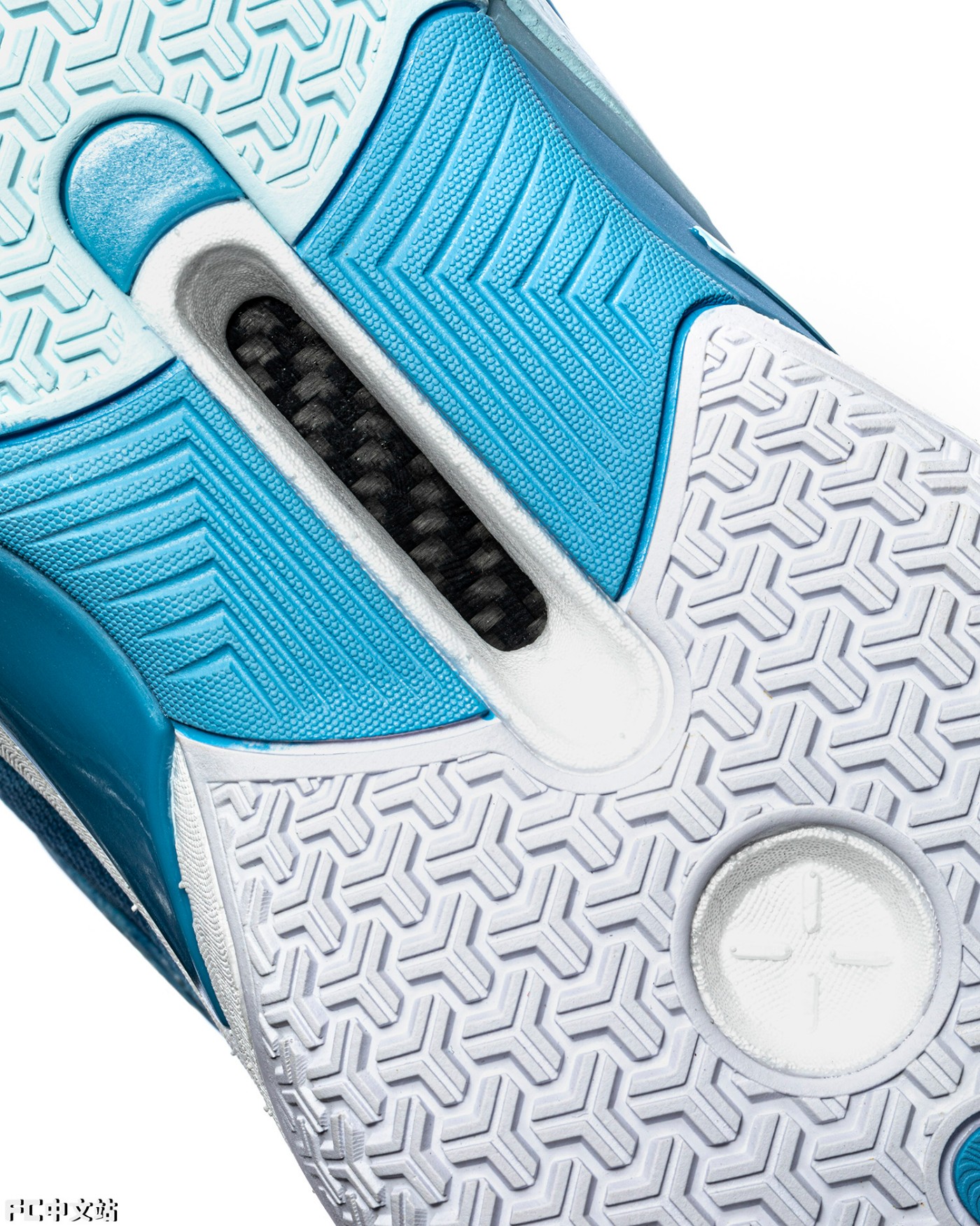 最后便是中底内镶嵌的复合碳纤推进系统,通过碳纤维板 + 尼龙玻纤复合材料的组合,为突破、起跳时的脚步增加推进感。