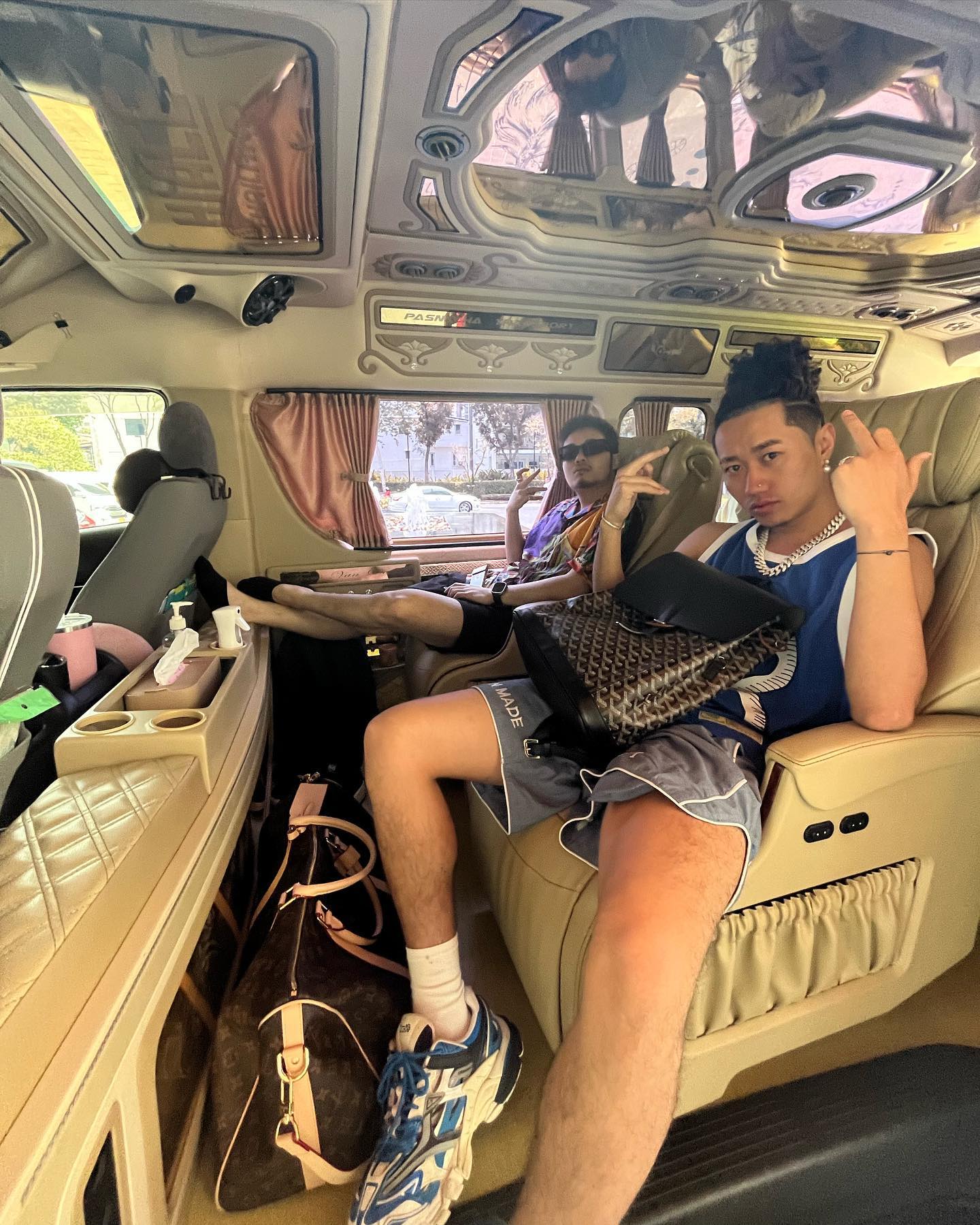 另外在台下,脚踏白蓝配色 Balenciaga 老爹鞋,豪车配 LV 和 Goyard。