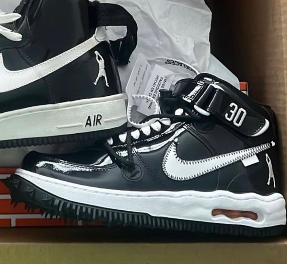 从图片中的开窗气垫和反光的黑色漆皮可以看出,他所穿的正是 OFF-WHITE 与 Nike 全新联名 Air Force 1 Mid “Sheed”。