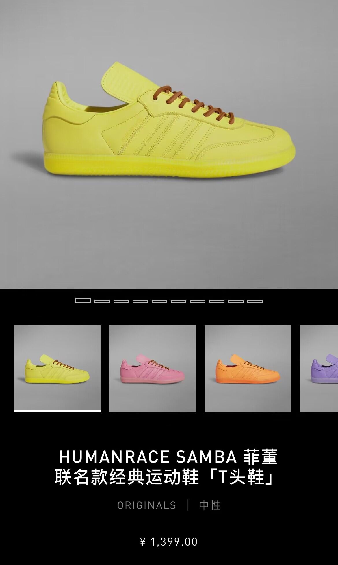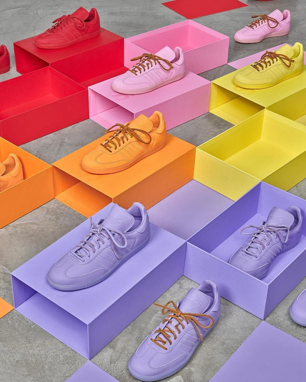 鞋型方面,选择以今年大火的 Samba 鞋型为基础,本次共推出黄、粉、橙、紫、红五款配色。