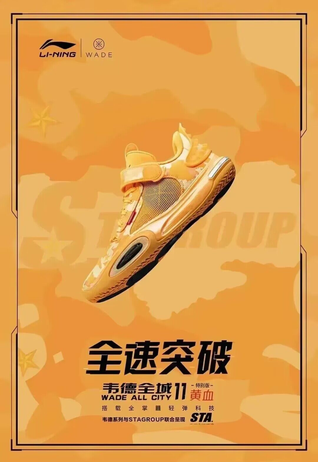 本次设计以韦德全城 11 为蓝本,融入 STA 经典黄血主题,鞋面大面积迷彩设计,鞋舌内侧印有团结、奋进字样,细节满满。