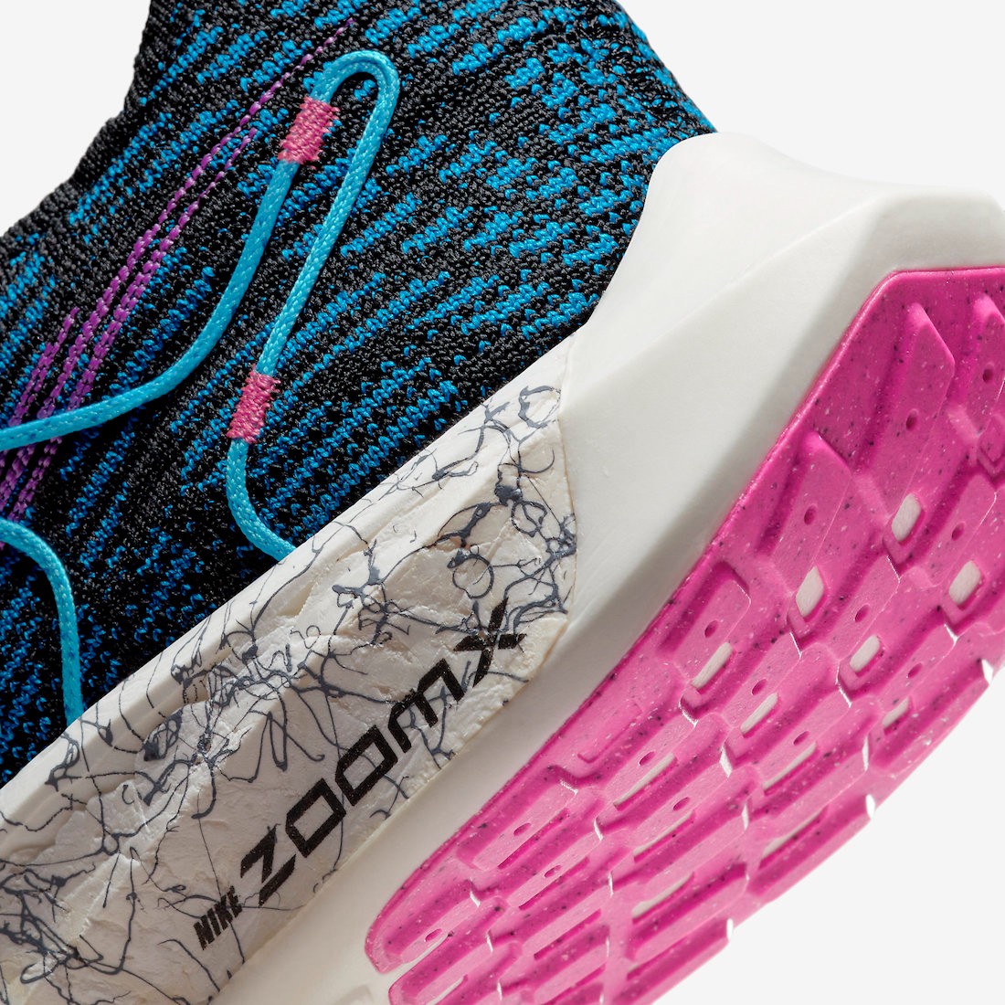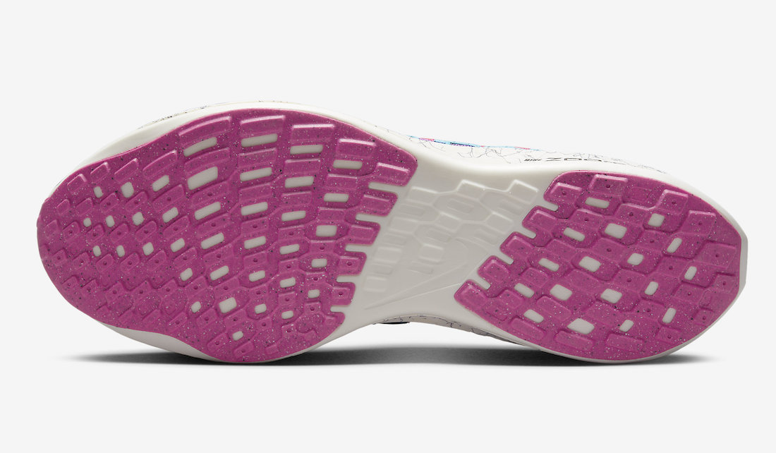 中底科技搭载 ZoomX 缓震泡棉,上面印有纹理图案以及 Nike 风车标志,彰显 Nike 的可持续发展战略。