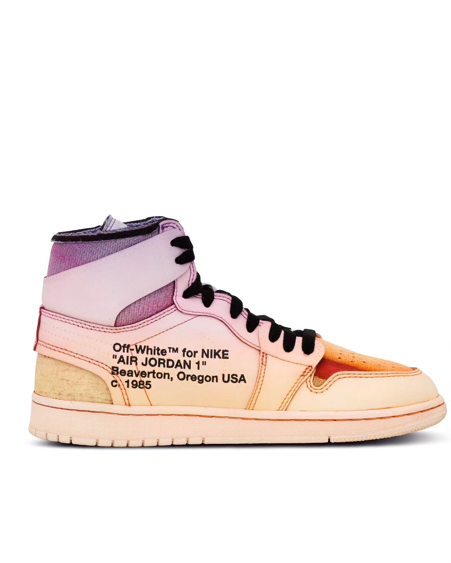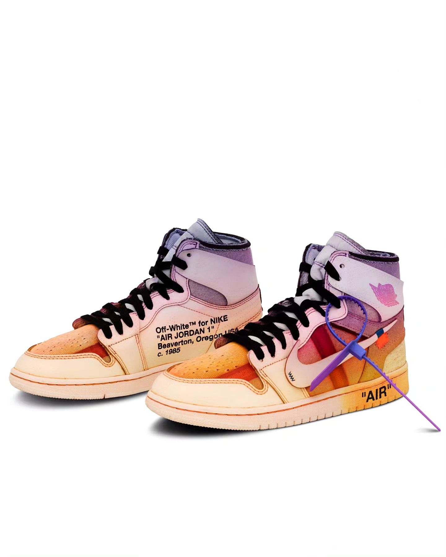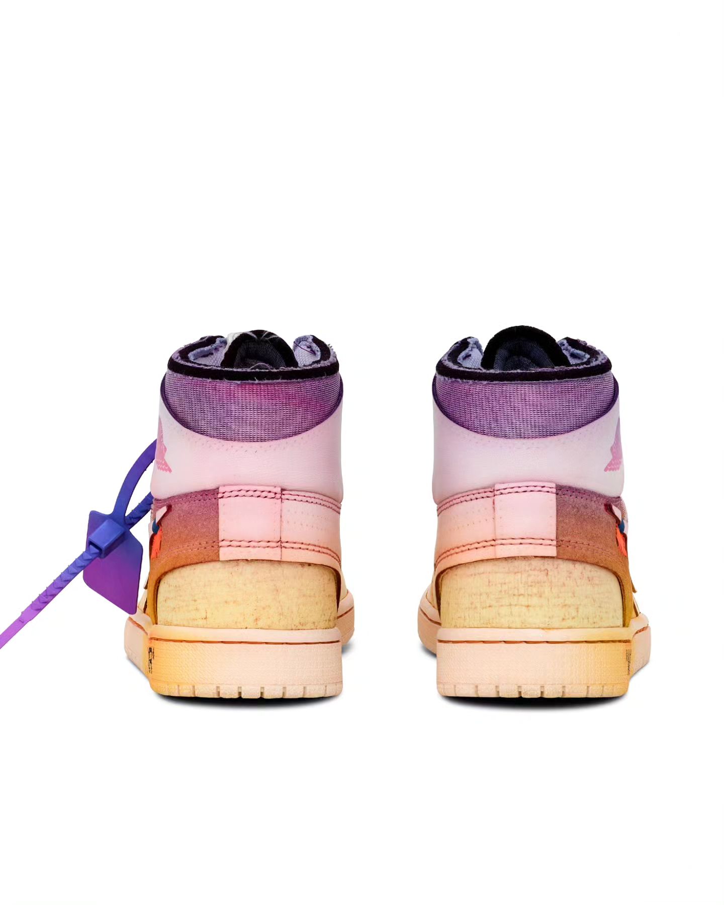 整双鞋设计依然延续 OFF-WHITE 经典的解构风格,采用彩虹扎染配色妆点,独一无二的色彩过渡让人过目不忘。