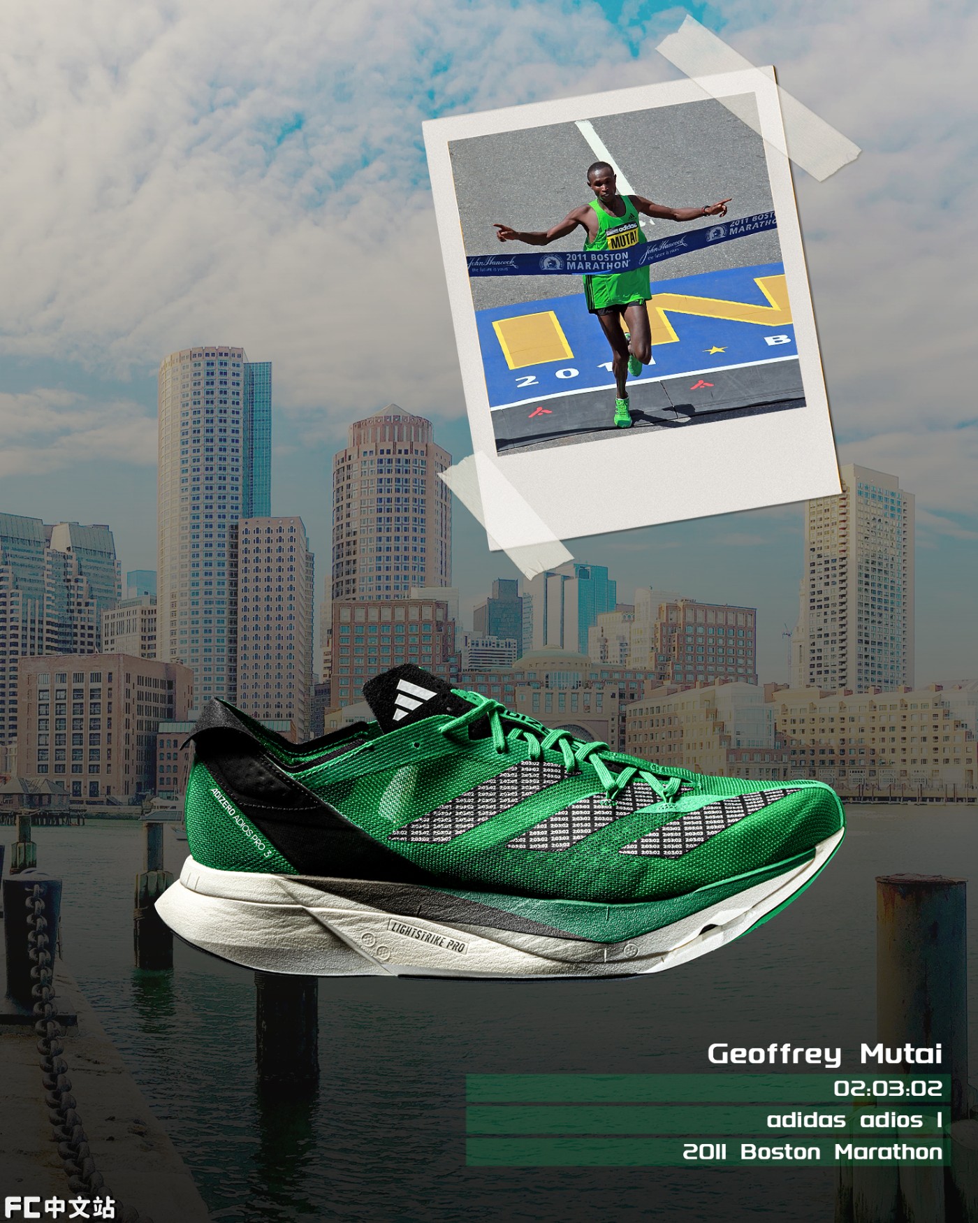 第二双黑绿配色属于 2011 年波士顿男子马拉松冠军得主 Geoffrey Mutai,他在比赛中以 2 小时 3 分 2 秒(平均配速 2 分 54 秒)的优异战绩夺冠。