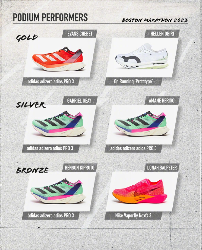 上个月波士顿马拉松比赛中,六位登上领奖台的选手中就有四位都选择了 ADIZERO ADIOS PRO 3,也从侧面印证了这双鞋的硬实力。