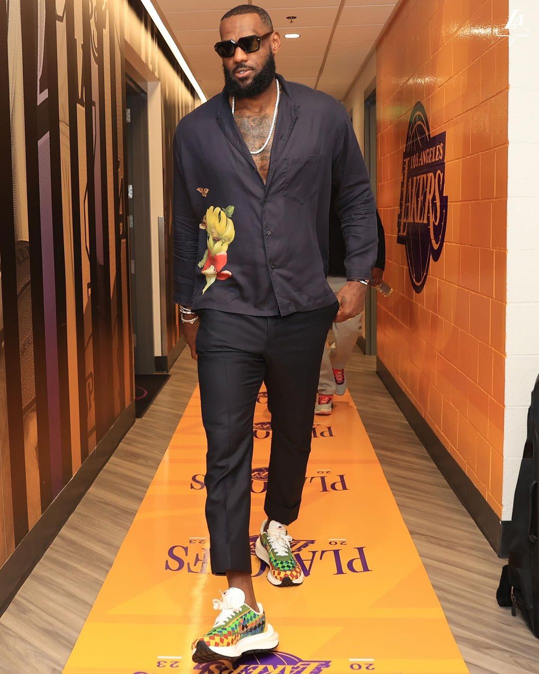 在刚刚结束的 NBA 赛事中,除了湖人战胜勇士成功杀入西部决赛外,入场前勒布朗·詹姆斯也率先上脚了一双十分花哨的 sacai x Nike Woven。