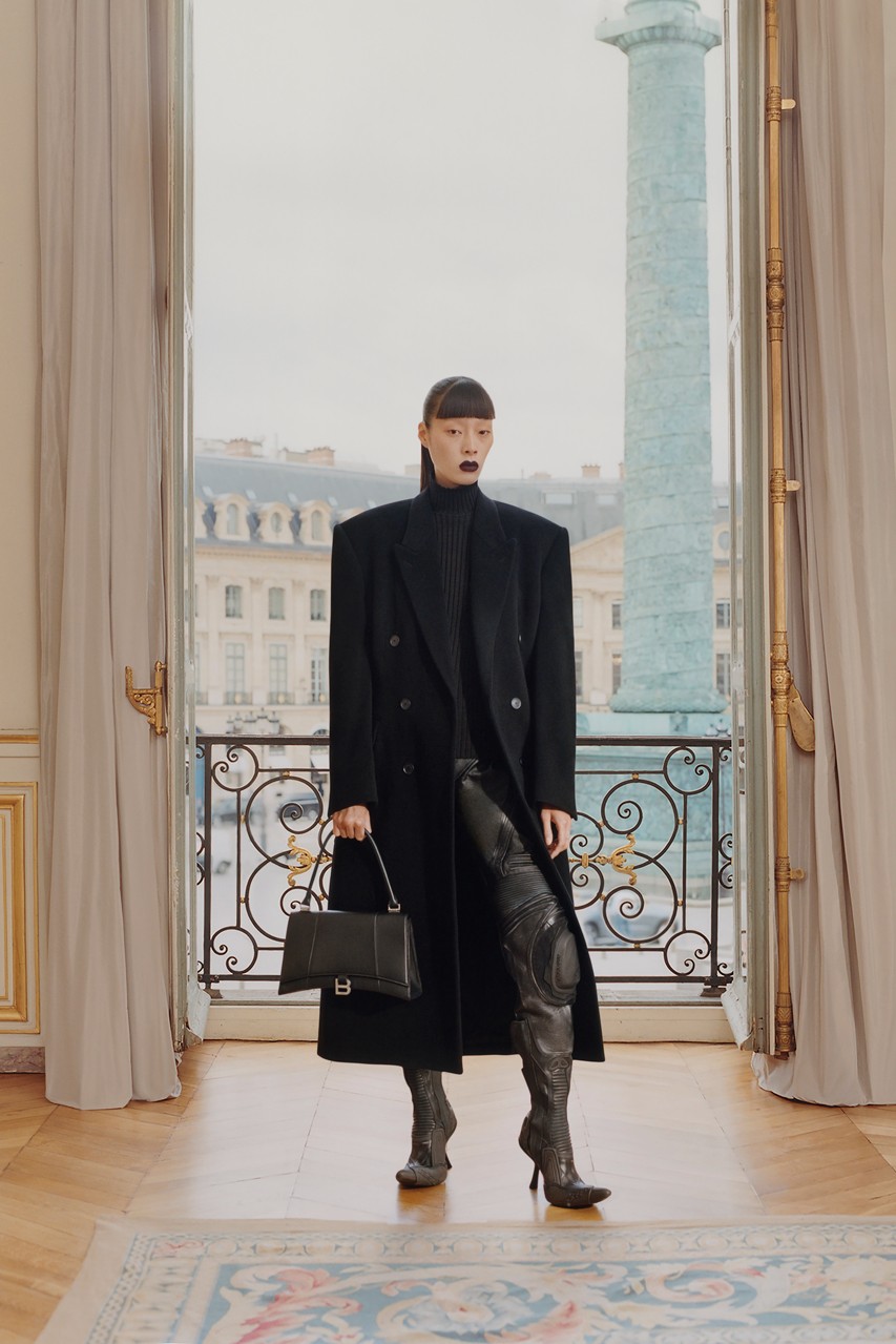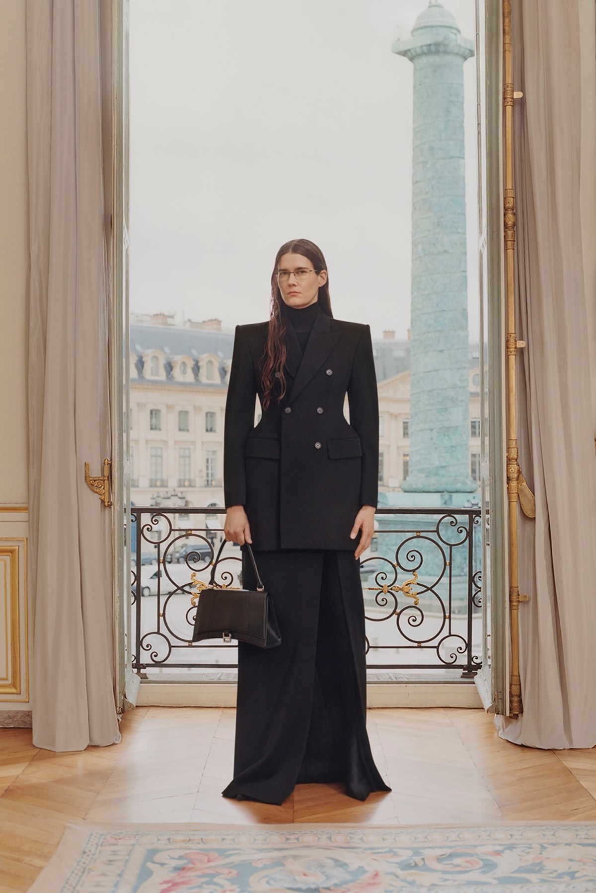 首先,当然是最经典的沙漏夹克(Hourglass jacket)经典的廓形 + 垫肩设计,营造出最为传统的 BALENCIAGA 外套造型。