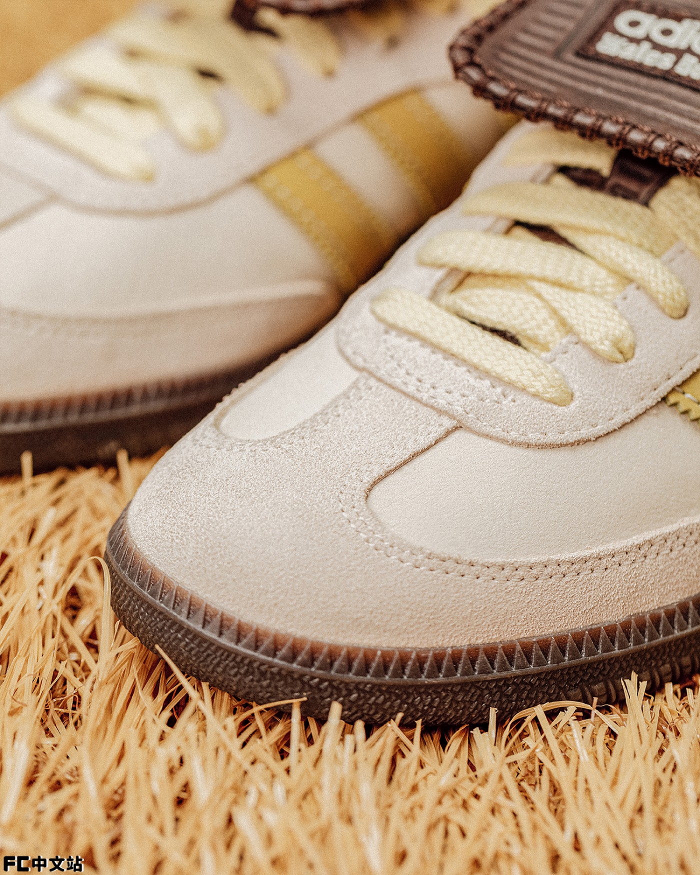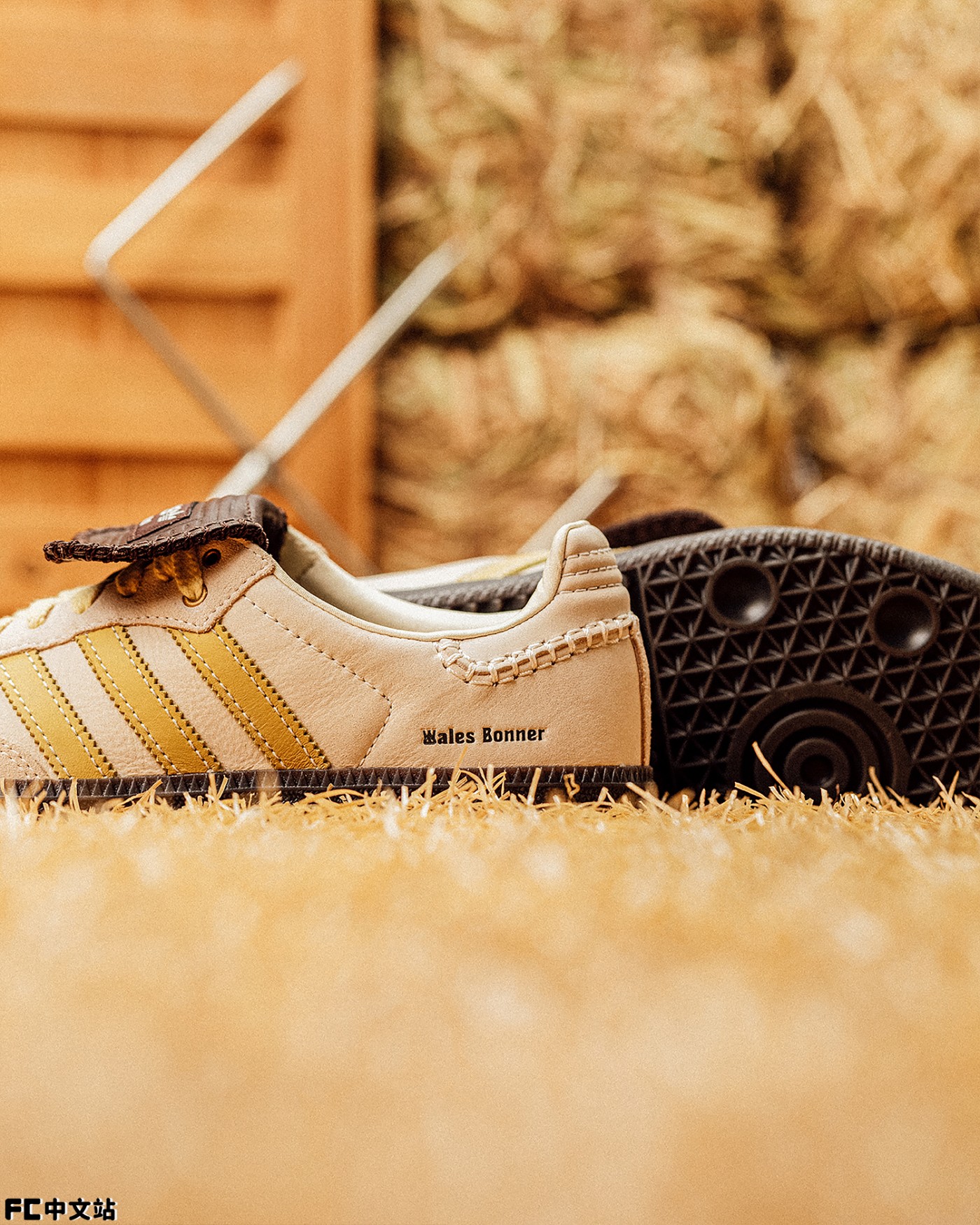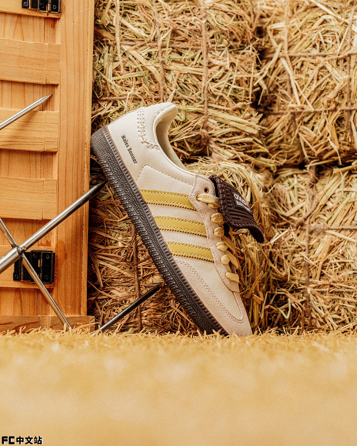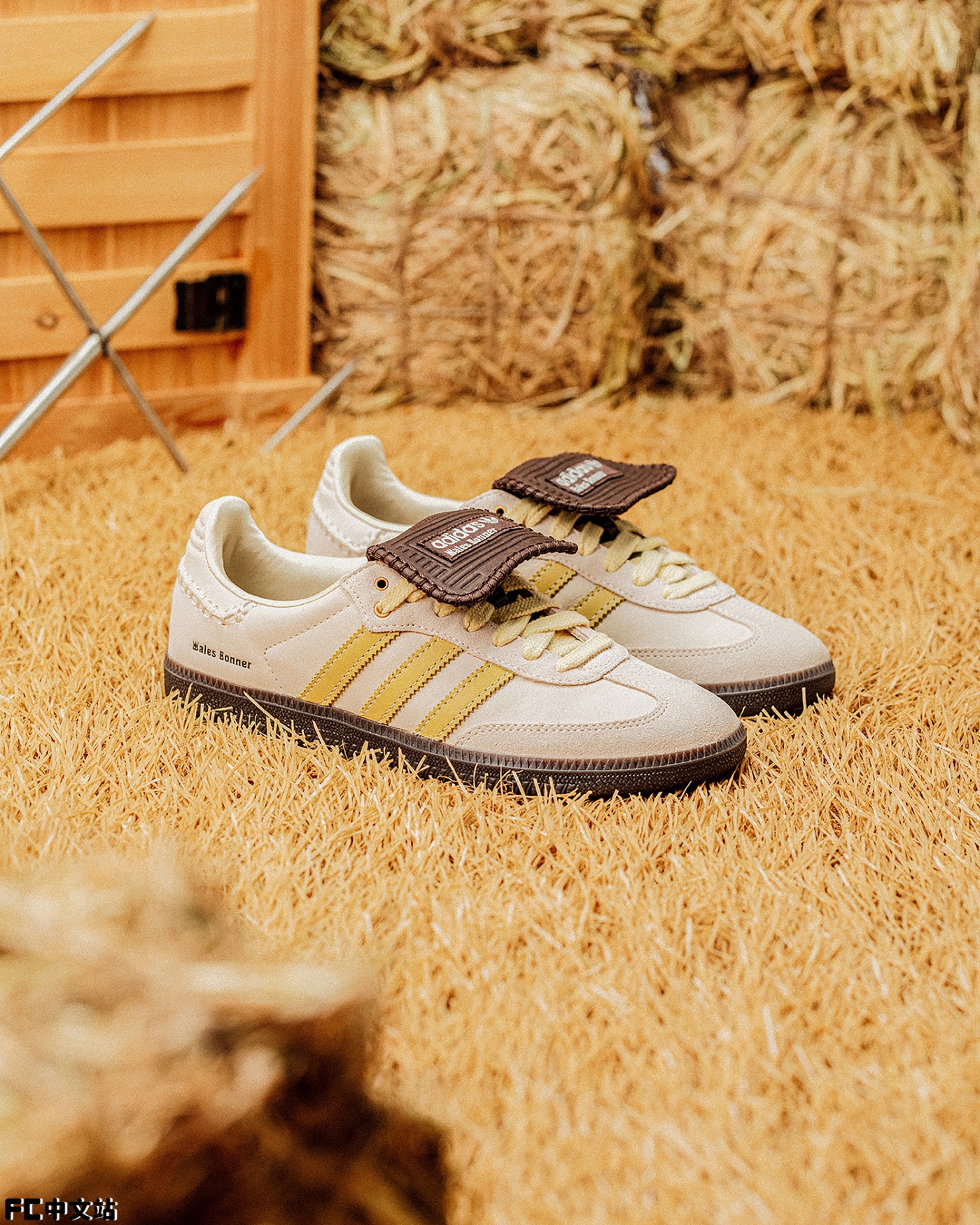 此次这双 Wales Bonner 联名款 Samba Nubuck 自然的灰色与复古做旧黄色相称,十分清新自然。