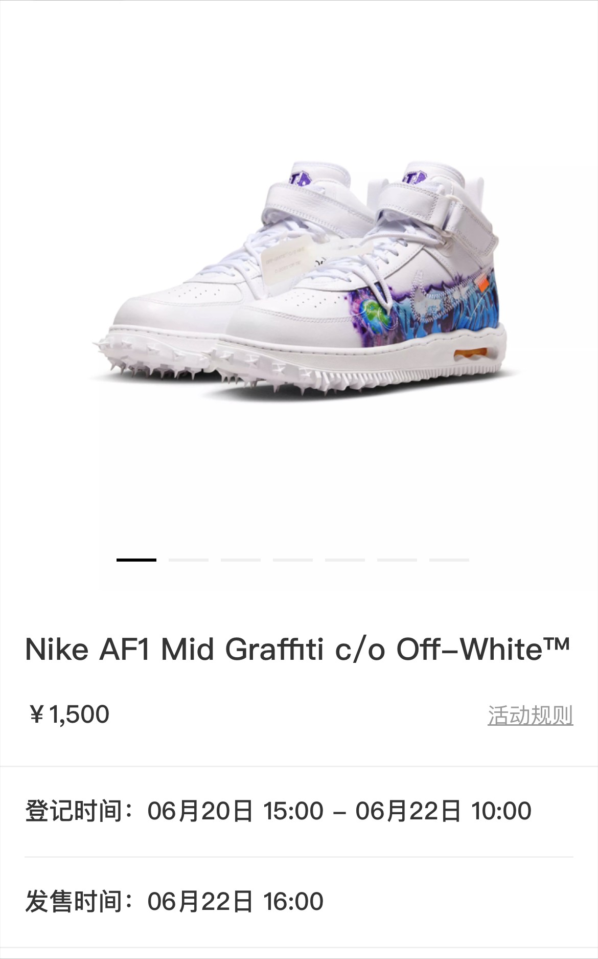 据悉,全新配色 OFF-WHITE x Nike Air Force 1 Mid “Graffiti” 将于 6 月 22 日 16 时全球同步发售,感兴趣的小伙伴可以多多关注一下。