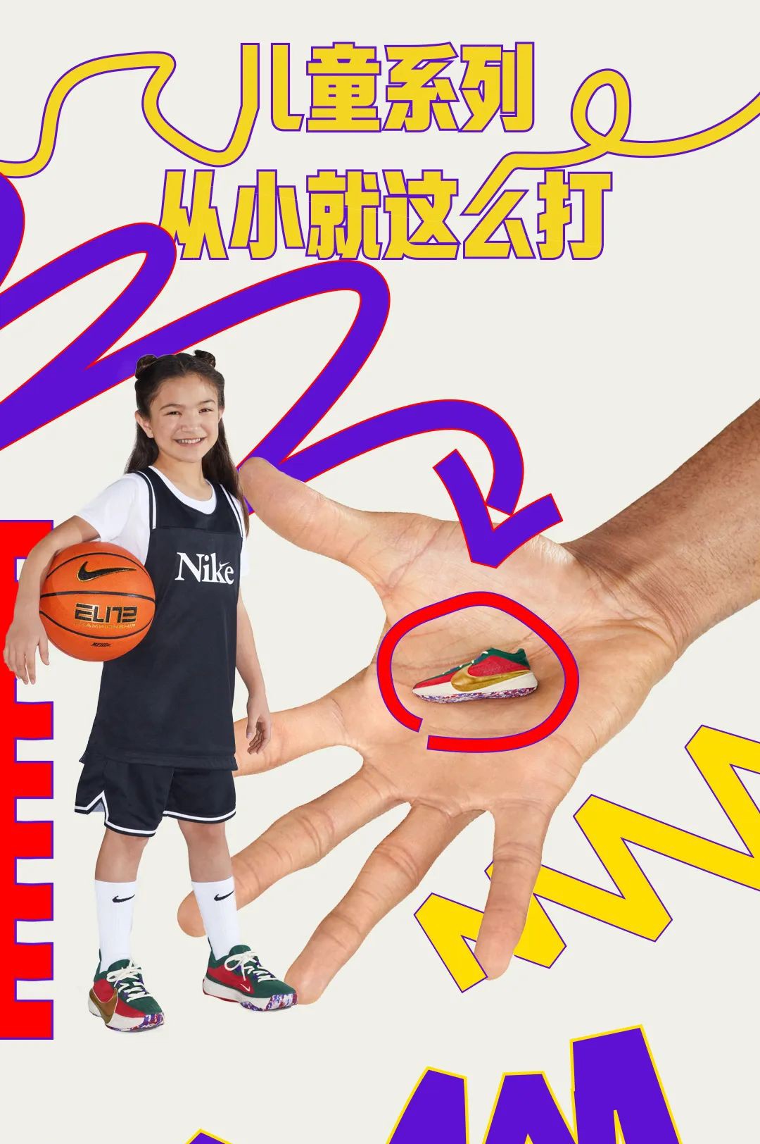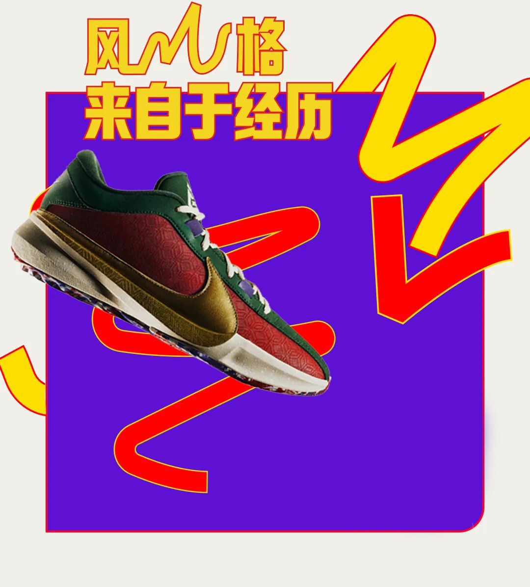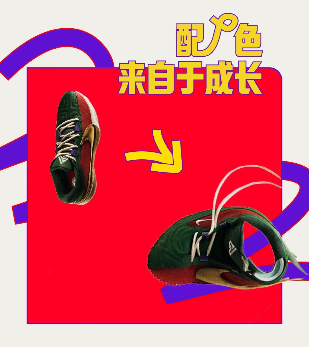 配色方面之所以选择红绿撞色示人,是为了致敬尼日利亚和希腊的成长经历,而硕大的金色 Swoosh 则是在显示着 NBA 总冠军的荣耀。