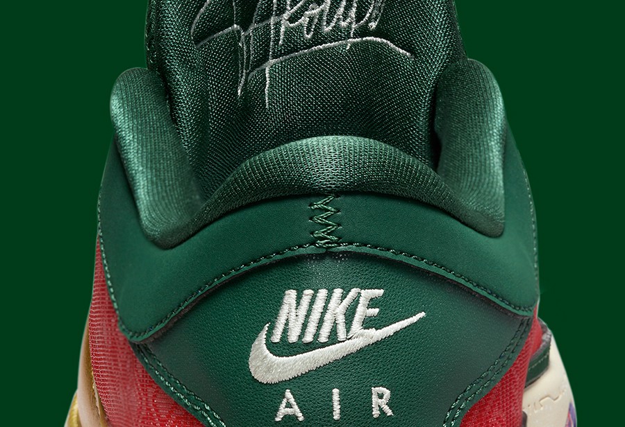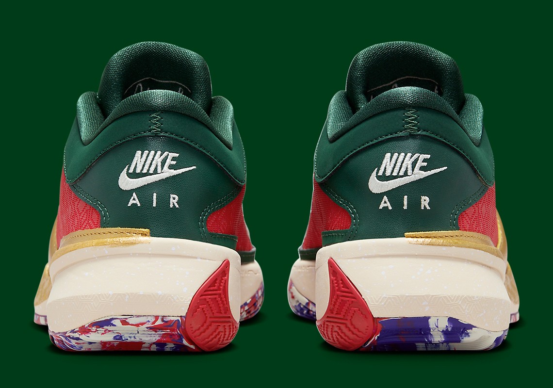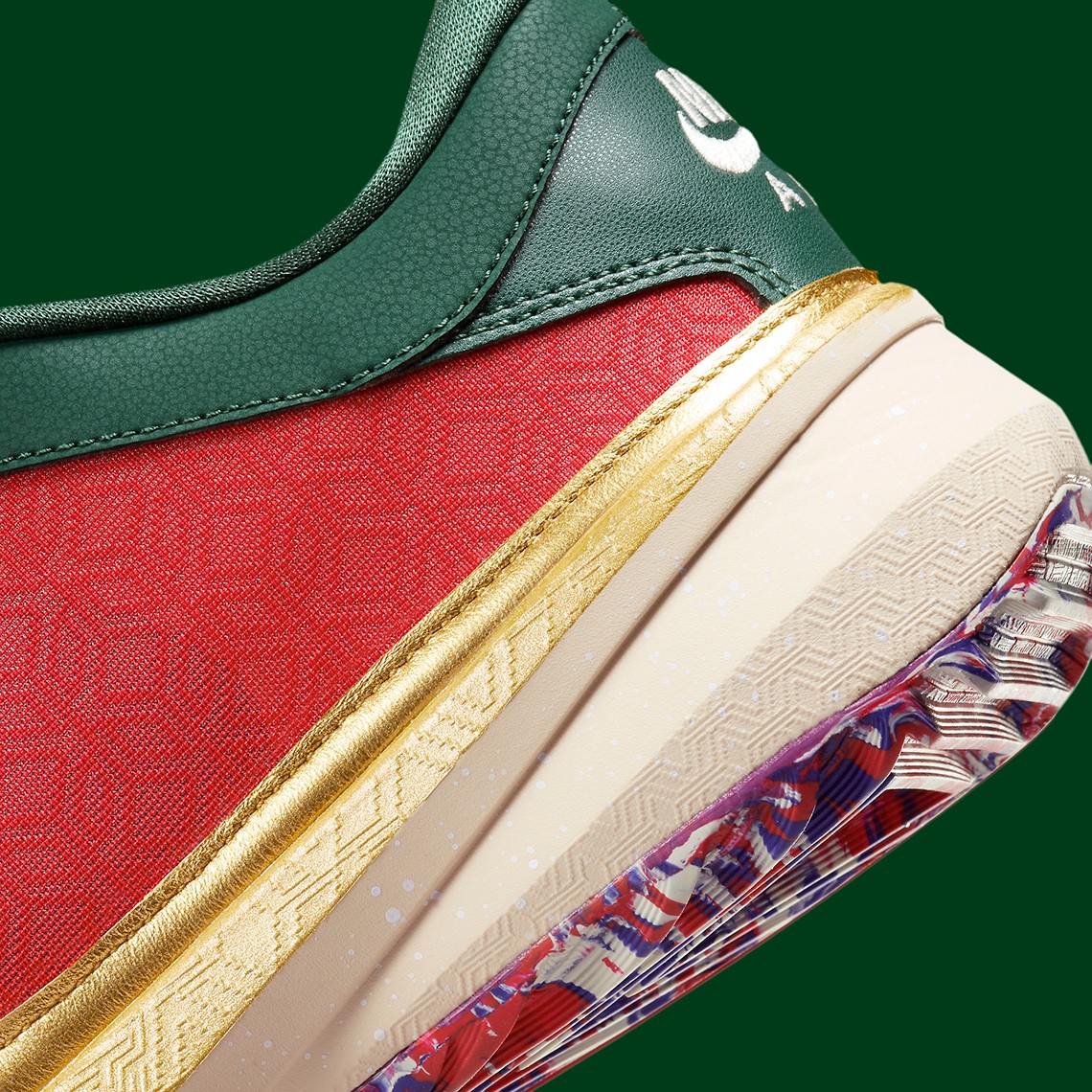 配色方面之所以选择红绿撞色示人,是为了致敬尼日利亚和希腊的成长经历,而硕大的金色 Swoosh 则是在显示着 NBA 总冠军的荣耀。