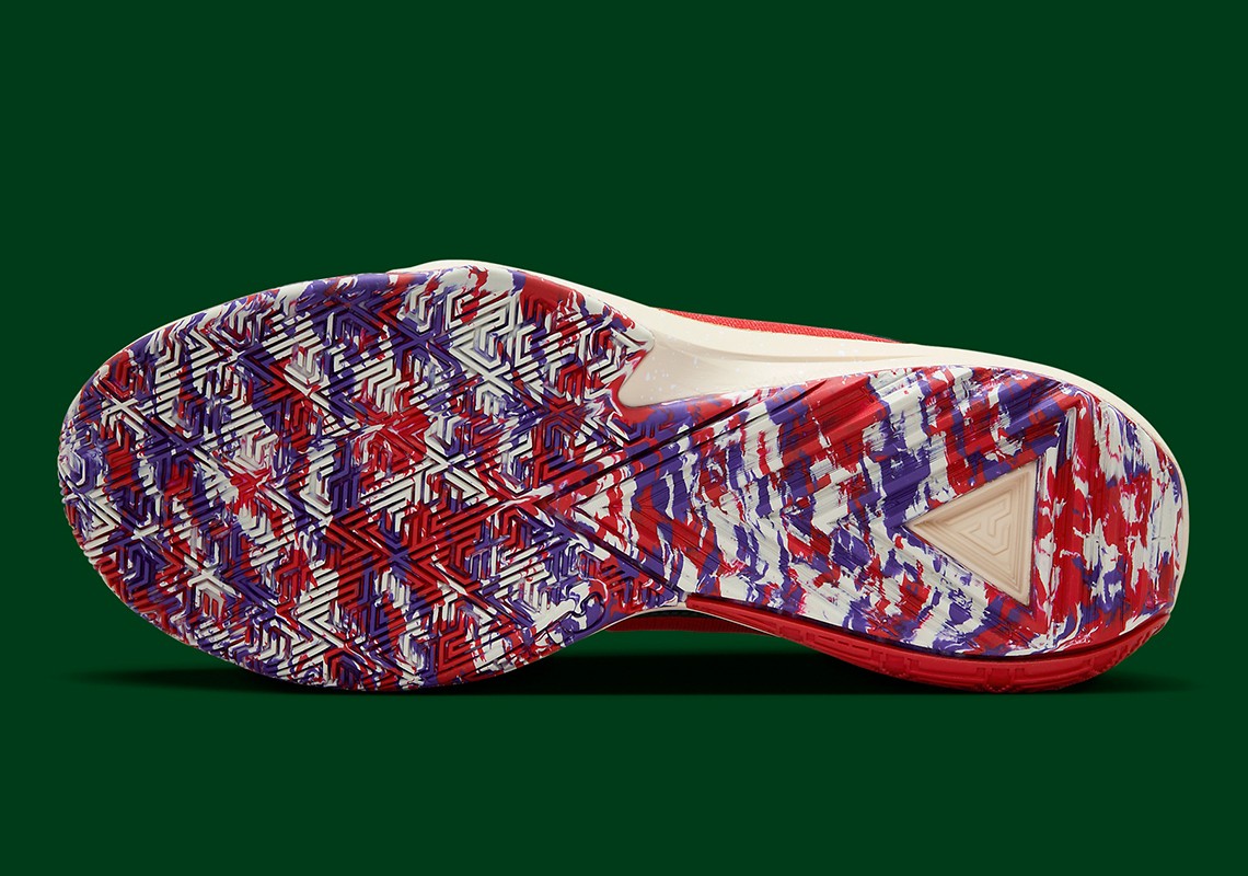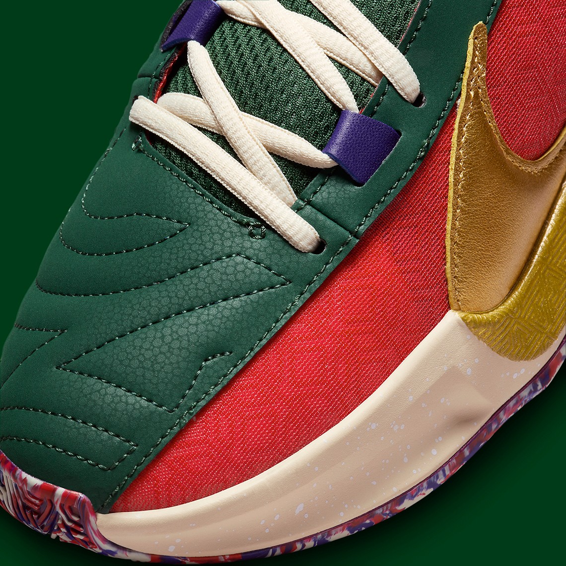 全新的 Nike Zoom Freak 5 以前低后高的流线型鞋身示人,其灵感取自足球鞋的低帮轮廓,除了有着速度感外,还进一步显示出了「字母哥」对于足球的偏爱。