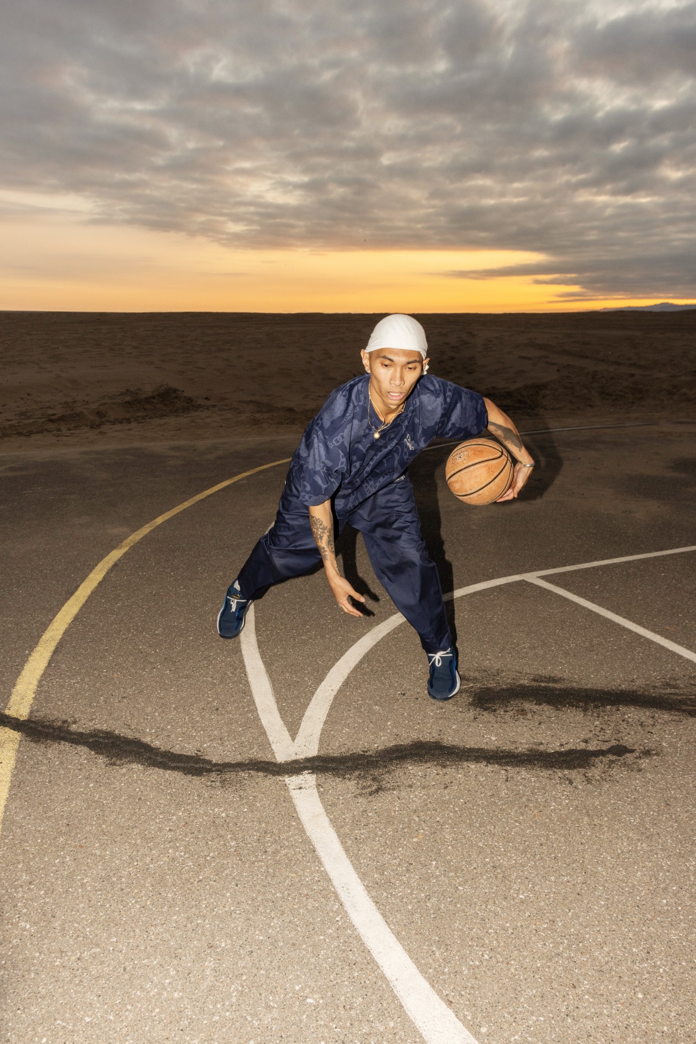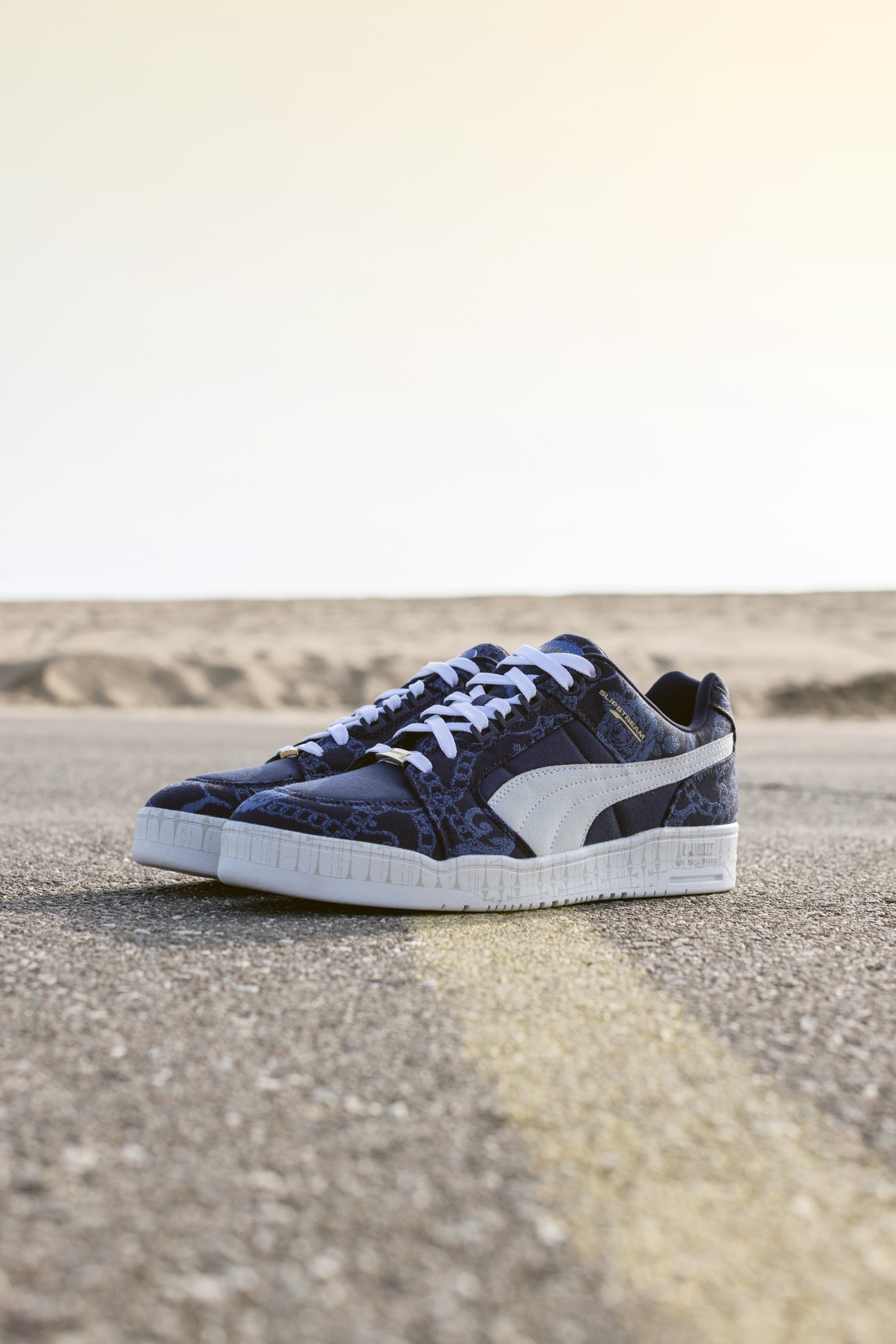 第一双以经典的 SLIPSTREAM 鞋型为蓝本,采用深蓝色妆点,白色和金色点缀,十分低调百搭。
