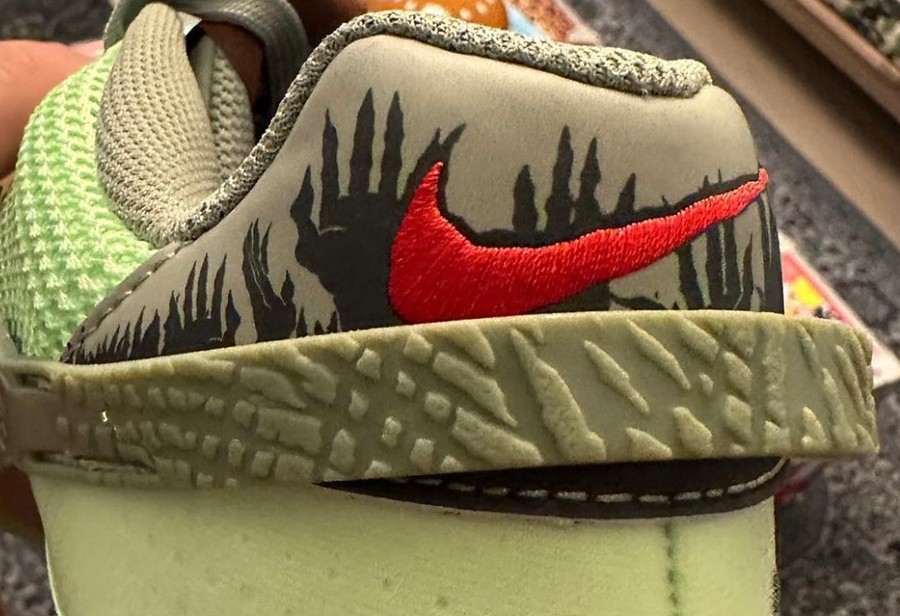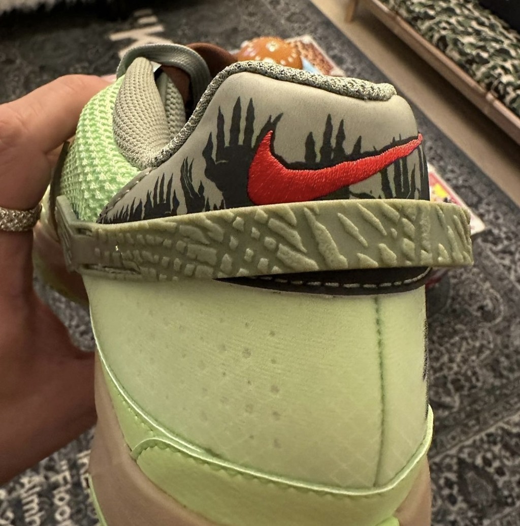 细节处融入大量僵尸、活死人的元素,比如鞋侧 Swoosh、后跟等地方都有体现。