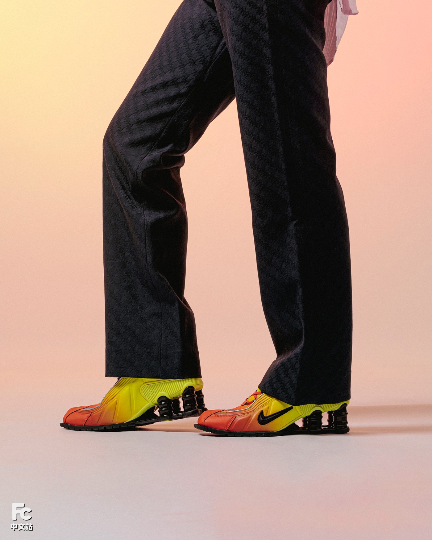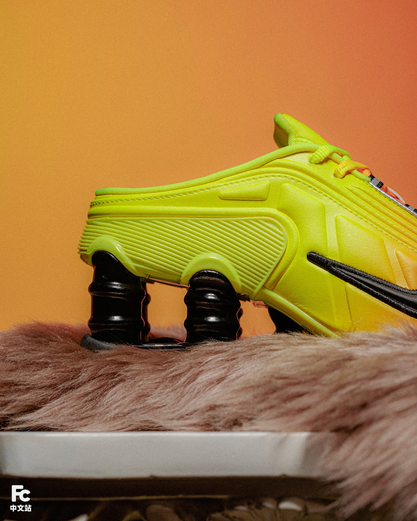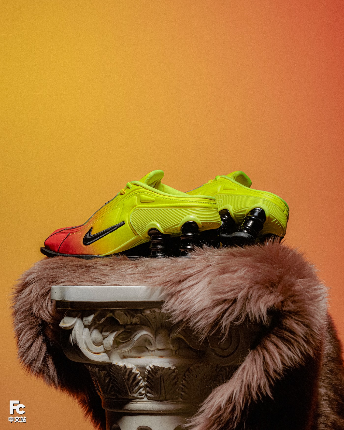 鞋型方面依旧是以 Nike Shox MR4 为蓝本,结合 Martine Rose 标志性方头皮鞋造型,由此孕育而生。