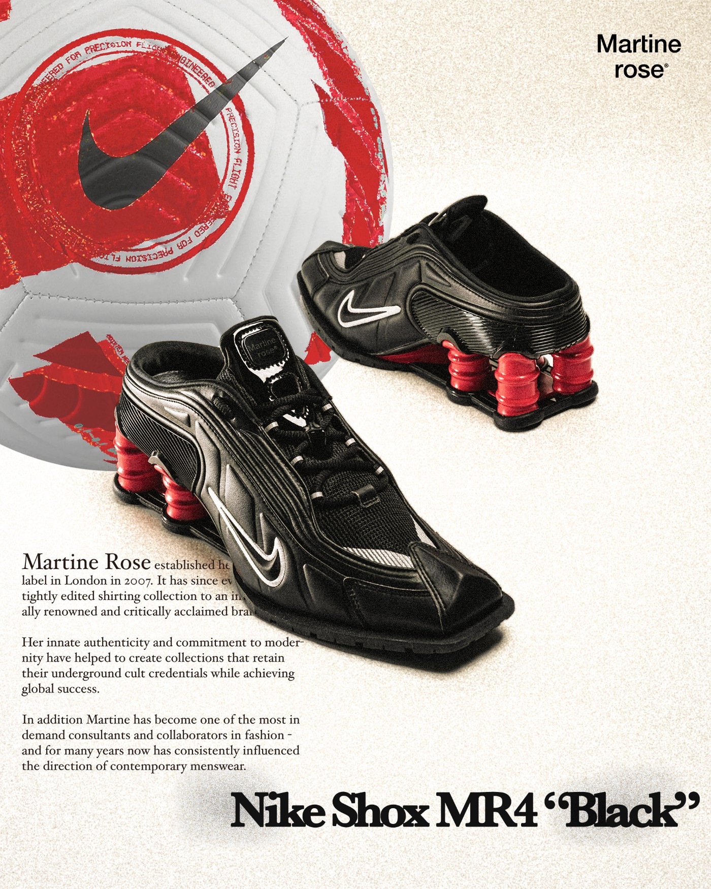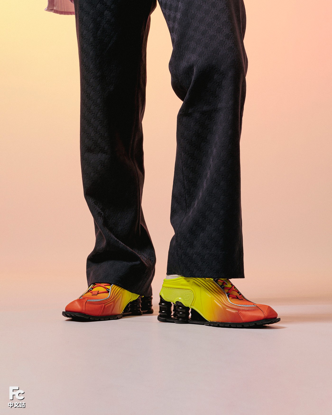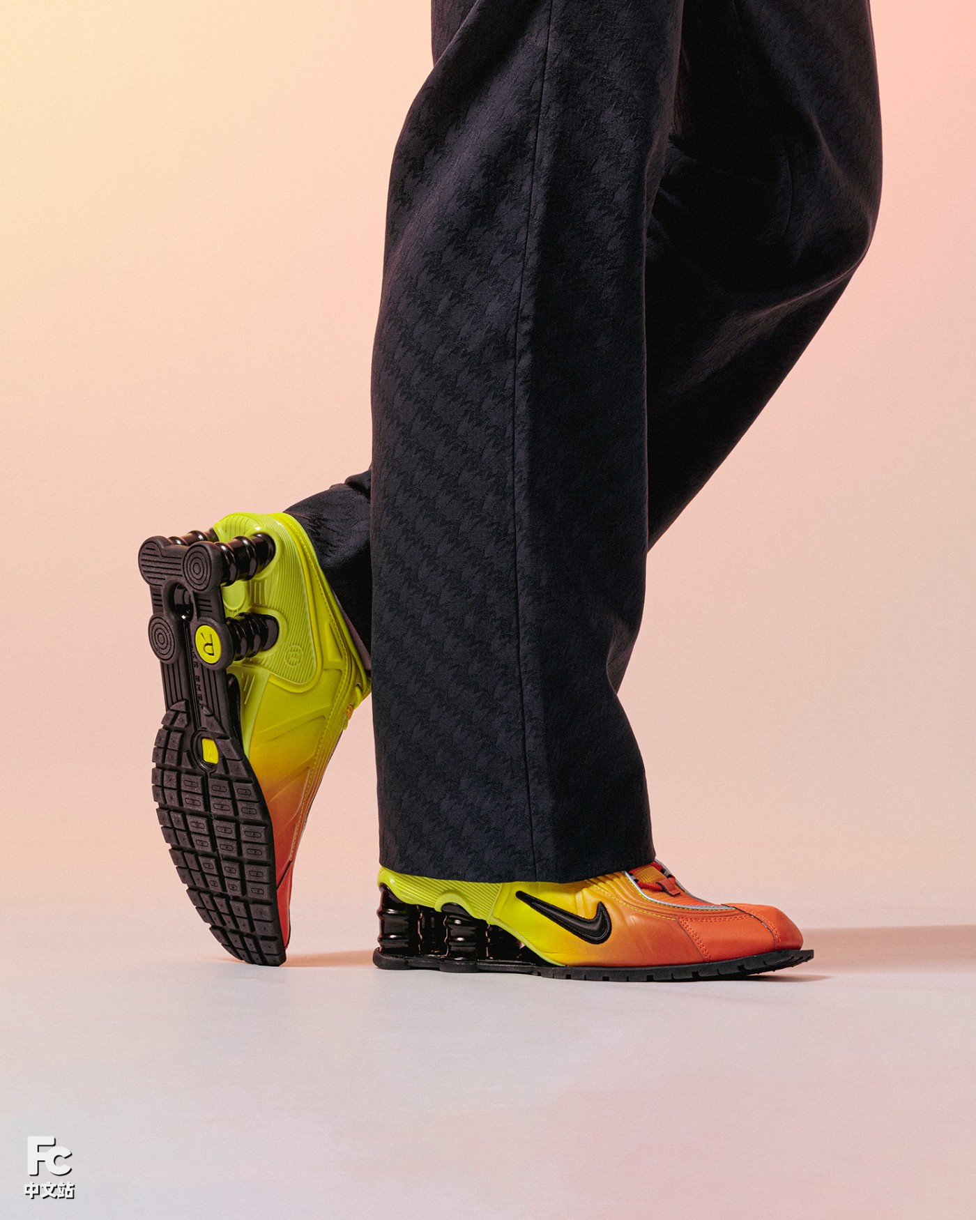 鞋型方面依旧是以 Nike Shox MR4 为蓝本,结合 Martine Rose 标志性方头皮鞋造型,由此孕育而生。